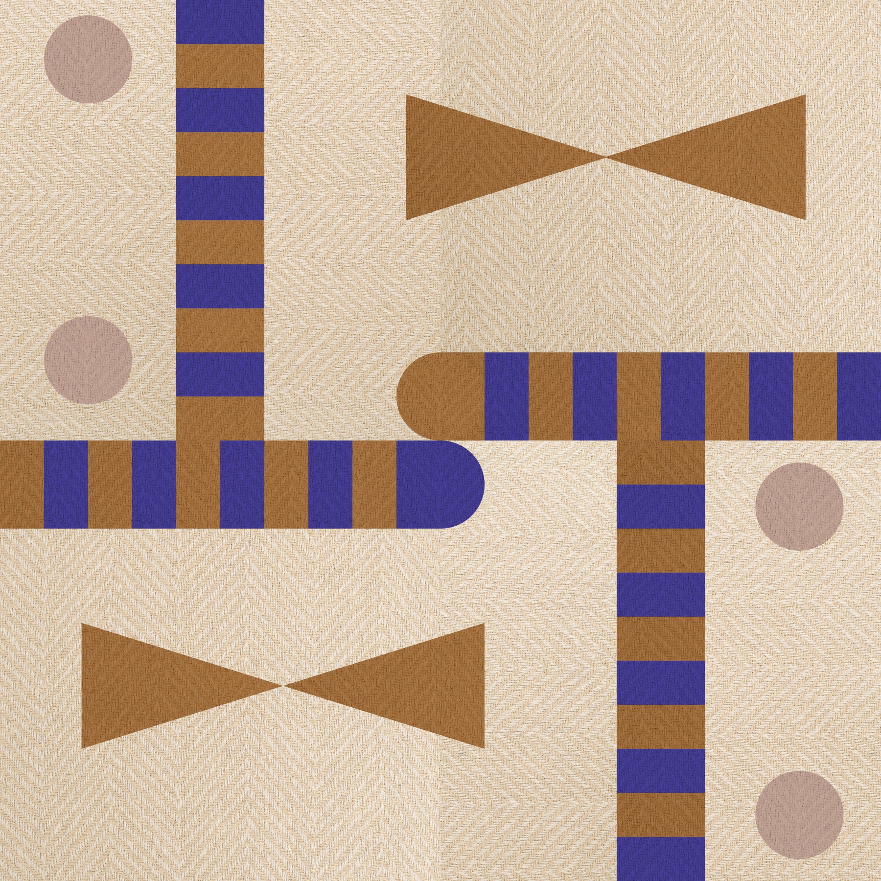 This wallpaper design presents a harmonious blend of earthy tones and geometric forms. The beige herringbone base provides a textural foundation, while stripes and bow-tie shapes in brown and a deep purple create striking visual accents. The color palette is both warm and inviting, exuding a sense of calm sophistication. This versatile design seamlessly integrates into various interior styles, offering a balanced aesthetic that adds depth and character without being overpowering. A perfect blend of contemporary and classic.