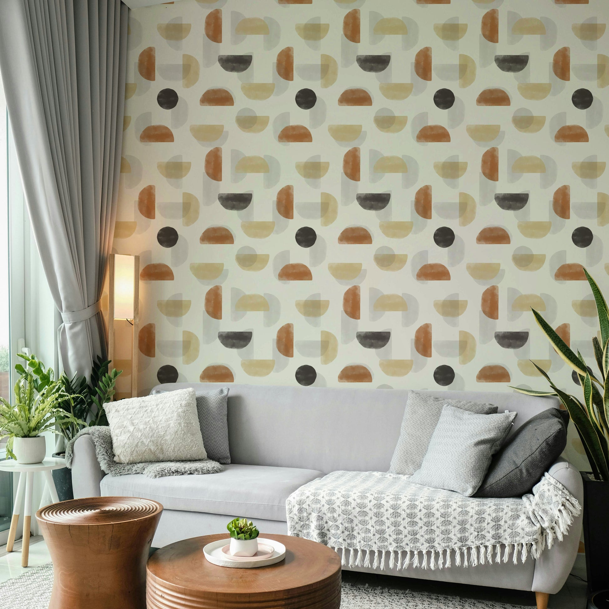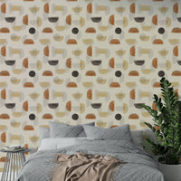 Experience the beauty of simplicity with this stunning abstract wallpaper. A curated collection of muted beige, terracotta, and grey semicircles and circles creates a harmonious and visually appealing pattern. The subtle texture and soft color palette evoke a sense of calm and sophistication, perfect for spaces that demand a touch of understated elegance. This versatile design effortlessly complements both modern and traditional interiors, adding depth and visual interest without being overwhelming.