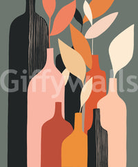 Immerse yourself in the serene world of 'Earthy Hues Bottle Decor', a sophisticated piece of wall art that brings a touch of organic elegance to any space. This artful composition features a collection of stylised bottles and abstracted botanical elements rendered in a warm, inviting palette of earthy tones. Shades of terracotta, muted orange, blush pink, and deep charcoal harmonise against a calming grey-green backdrop, creating a visually soothing and balanced aesthetic. The simple yet elegant shapes of the bottles are juxtaposed with the organic forms of abstract leaves, adding depth and visual interest. The subtle textures and variations within the solid blocks of colour lend a hand-crafted feel, enhancing the artwork's unique charm. Invite a sense of understated sophistication and nature-inspired tranquility into your living space with this exceptional piece, perfect for creating a relaxing and stylish atmosphere.