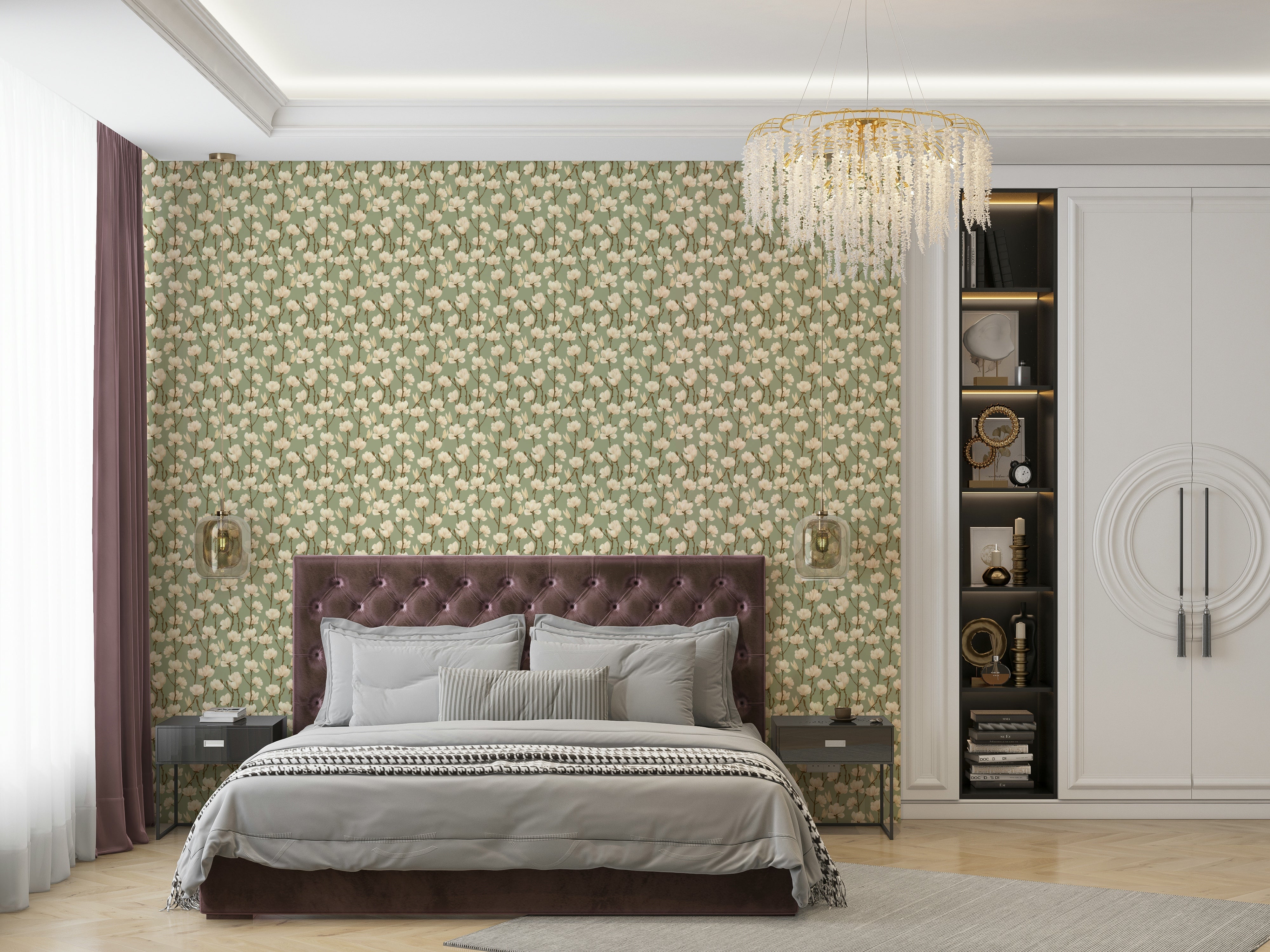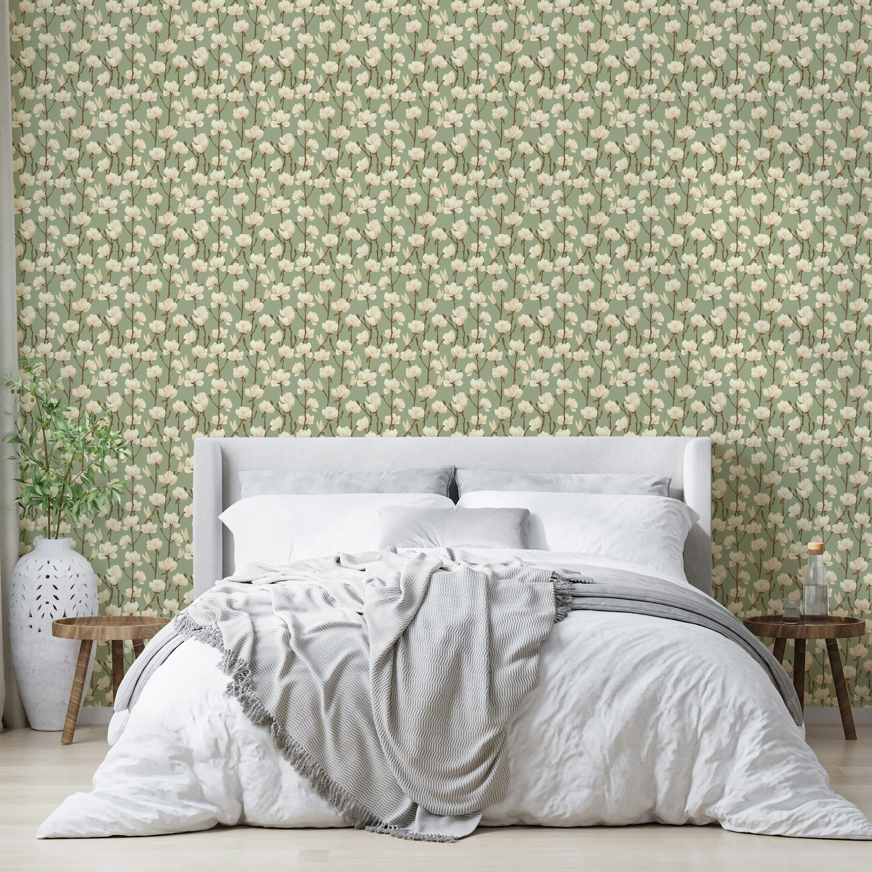 Embrace a sophisticated natural aesthetic with this wallpaper featuring a lush display of creamy white magnolias on brown branches, artfully set against a muted green background. The hand-painted style gives the design a textured, artistic feel, offering a unique and calming visual appeal. The seamless pattern of blossoms and branches creates a continuous, organic flow. The muted color palette adds a touch of earthy sophistication, making it an ideal choice for those who appreciate understated elegance and organic design. This versatile wallpaper is perfect for a variety of spaces, including bedrooms, living rooms, and hallways, creating a serene and peaceful environment.