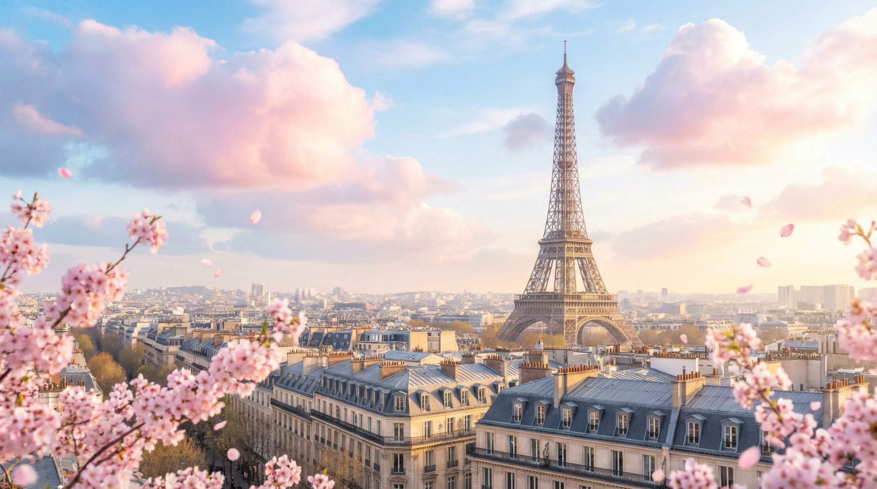 Infuse your home with Parisian elegance. This wallpaper for walls showcases the Eiffel Tower framed by delicate cherry blossoms against a soft, pastel sky. The serene colour palette of blush, cream, and gentle blue evokes a sense of tranquility. Perfect for a bedroom, living room, or dining area, this design brings a touch of European sophistication to your interiors. It creates a peaceful backdrop that complements both modern and classic décor. Let this wallpaper transport you to a spring day in Paris. It will elevate the room with its gentle beauty and timeless charm.