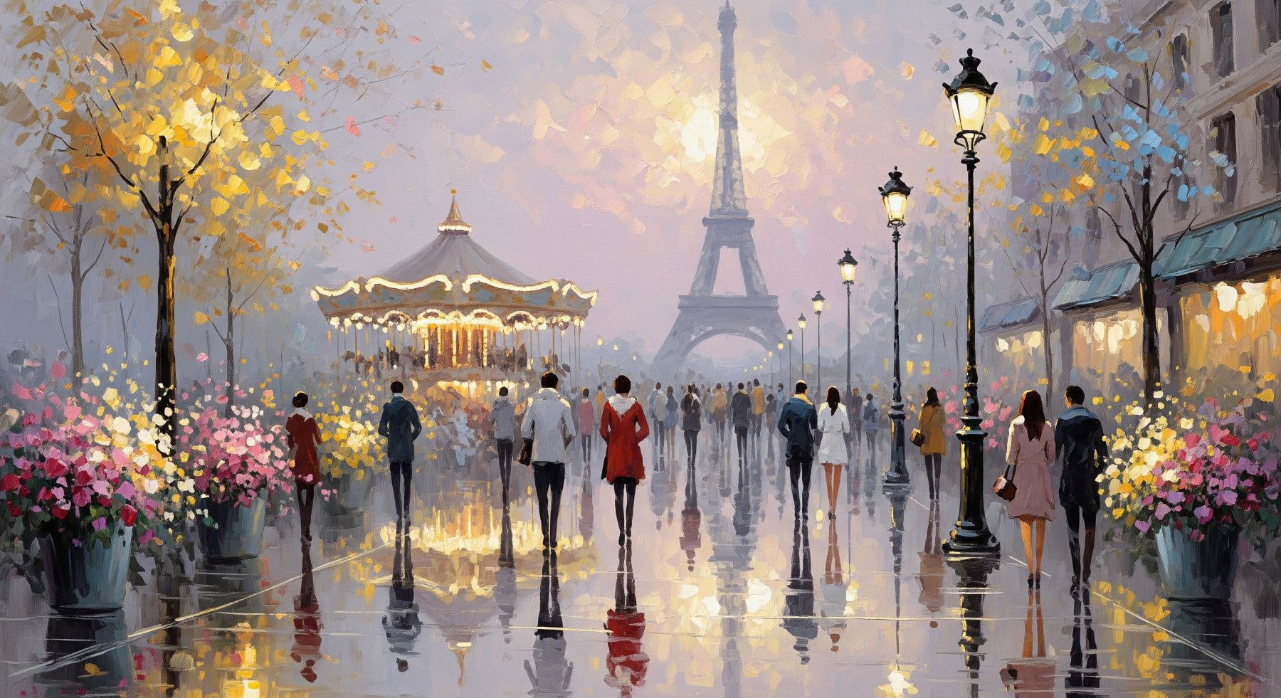 Infuse your home with the allure of Paris using this dreamlike scene. Soft pastel tones and gentle brushstrokes bring the city's iconic landmarks to life. A carousel and the Eiffel Tower offer a captivating backdrop for figures strolling on a rainy day. This wallpaper for walls creates a sophisticated and inviting ambience in any interior. Use it in a living room, bedroom, or office for a touch of French elegance. The reflective surfaces add depth, while the subdued colour palette complements a range of décor styles, from classic to modern.