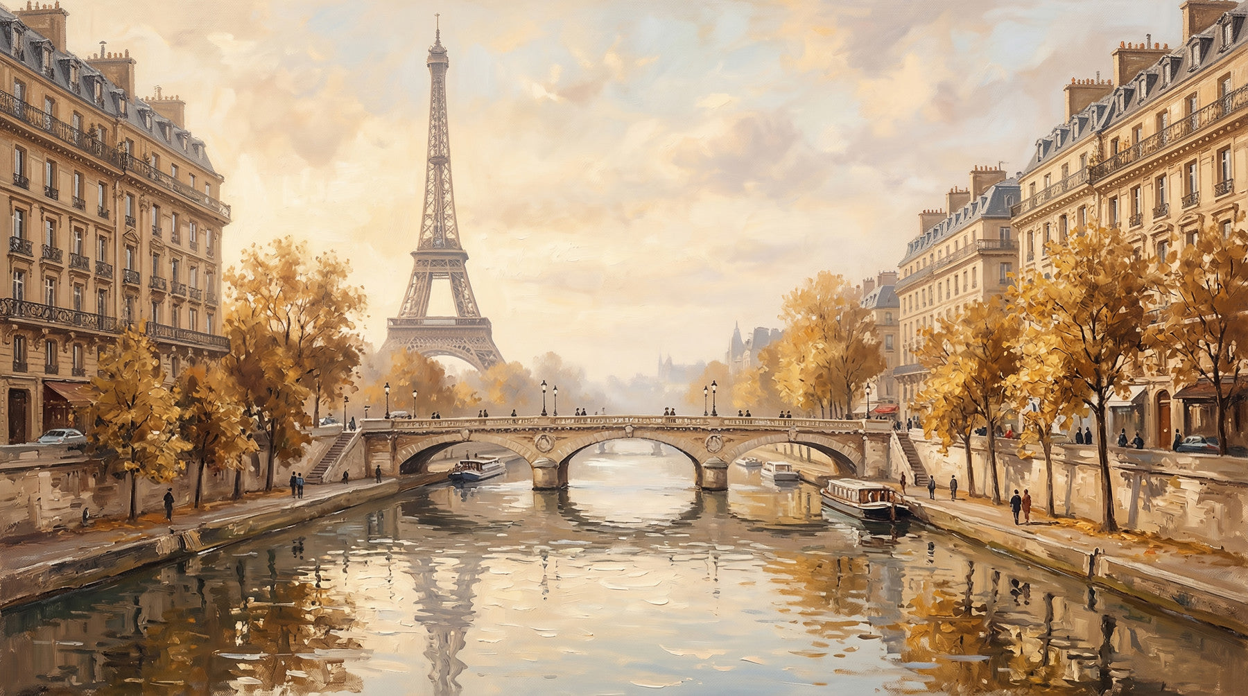 This exquisite wall mural captures the timeless beauty of Paris in a stunning painterly style. Immerse your space in the romantic ambiance of autumn, featuring the iconic Eiffel Tower rising majestically above the Seine River. Golden-hued trees line the historic banks, complementing the classic Haussmannian architecture. Rich browns, warm creams, and soft sky blues define the elegant colour palette, creating a serene and inviting atmosphere. This design enhances living rooms, dining rooms, or hallways, bringing a sophisticated charm and an artistic touch to your interior. It evokes wanderlust and transforms any wall into a picturesque Parisian vista.