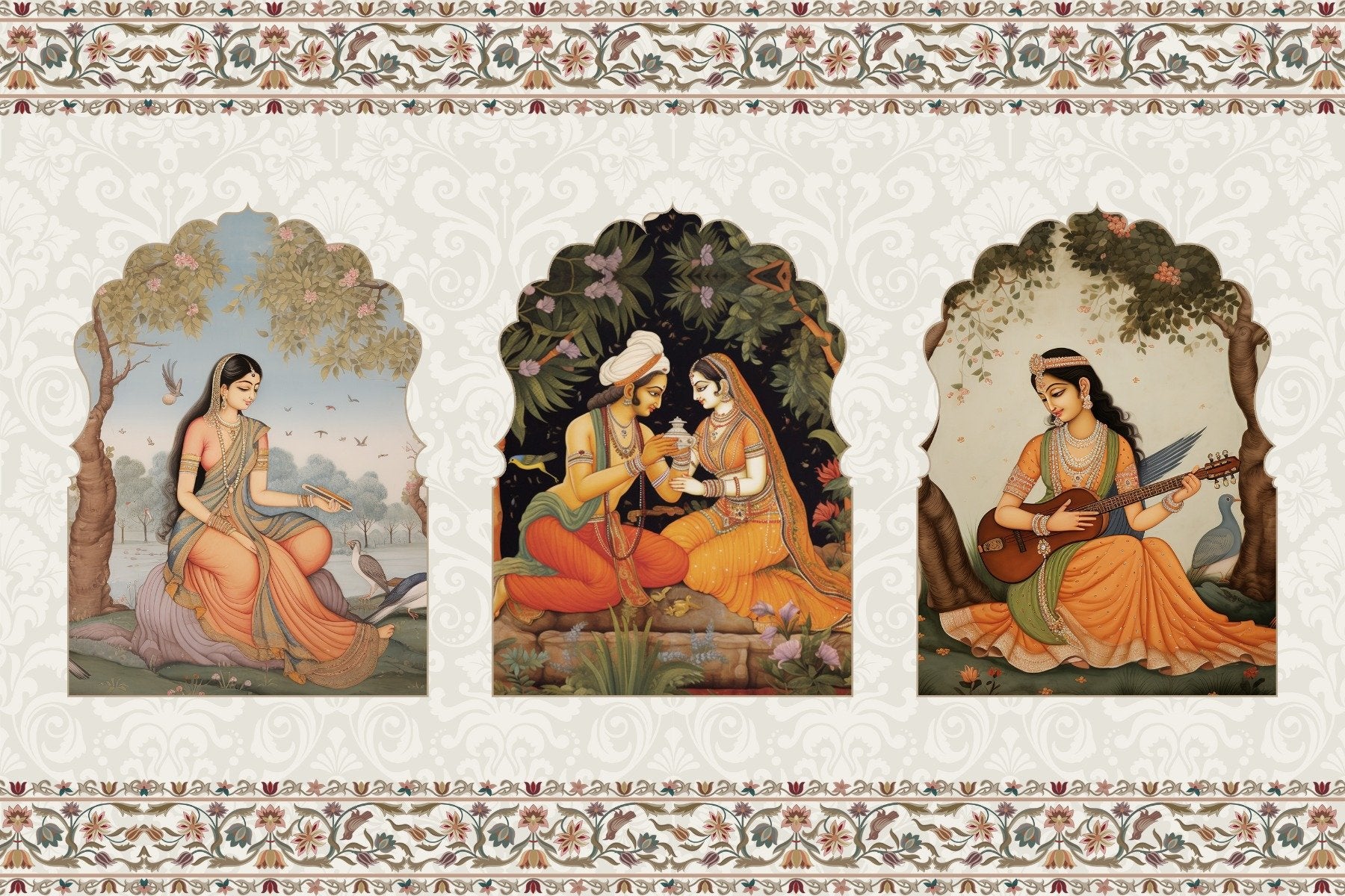 The elegance of the East royal mural is a vintage wallpaper that celebrates the storied grandeur of India's royal heritage. Each panel is a window into a bygone era, where Indian princesses are depicted in moments of grace and cultural richness. Their poised elegance is captured in vibrant hues and delicate details, bringing regal beauty to any room. This mural is a tribute to the timeless tales of Indian lore, crafted with a finesse that bridges past and present. Ideal for those who appreciate historical depth and artistic beauty, this Princesses wallpaper is more than a decor piece it's a narrative tapestry that adorns your walls with stories of majesty and tradition.