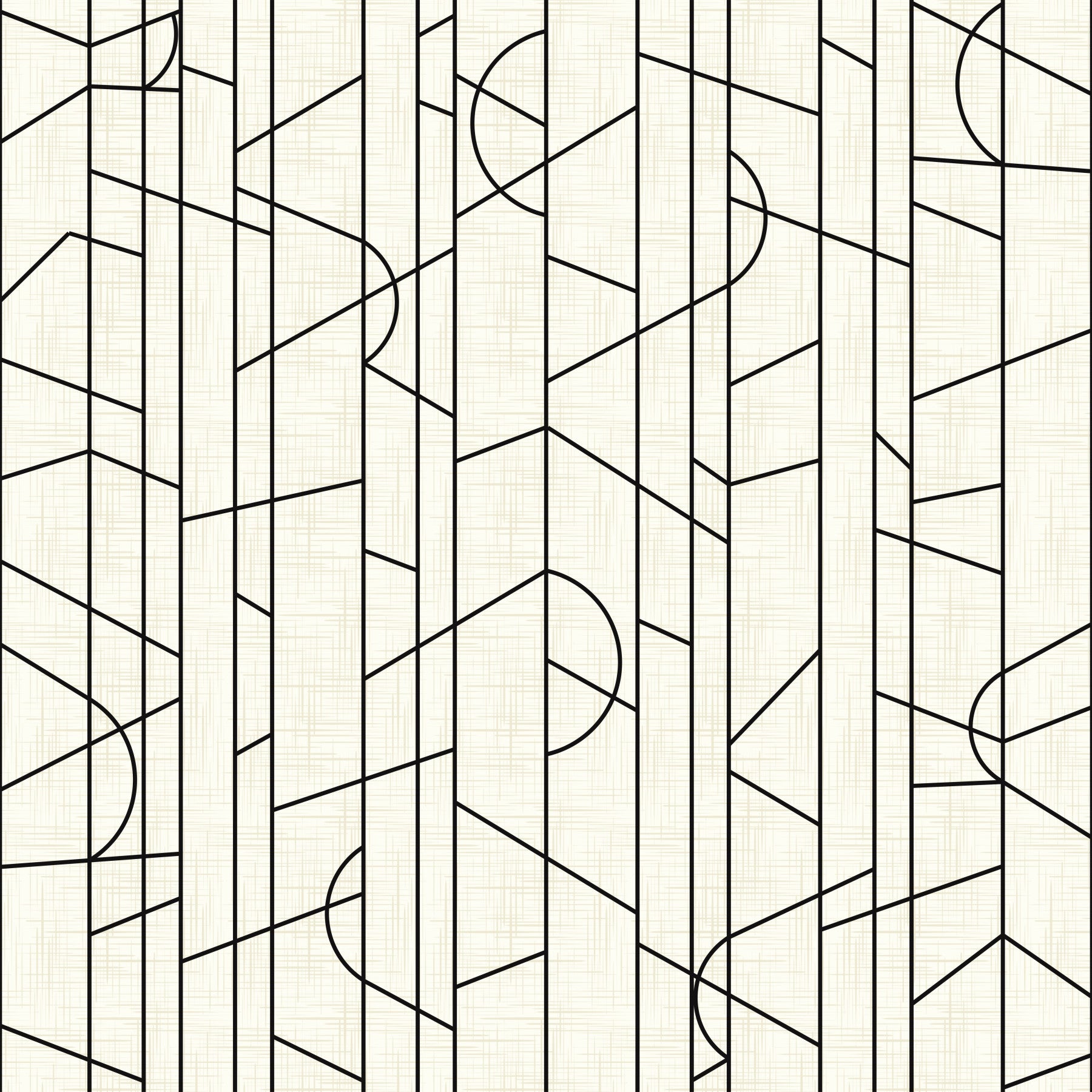 This striking wallpaper showcases a sophisticated interplay of black lines and geometric shapes against a textured, off-white background. The design features a repeating pattern of elegant, art deco-inspired lines creating a sense of refined structure and visual rhythm. Subtle curves and semi-circles contrast with the sharp angles, adding a touch of fluidity and movement. The textured background adds depth, enhancing the overall luxurious feel. This black and white masterpiece brings a touch of modern elegance and minimalist sophistication to any space.