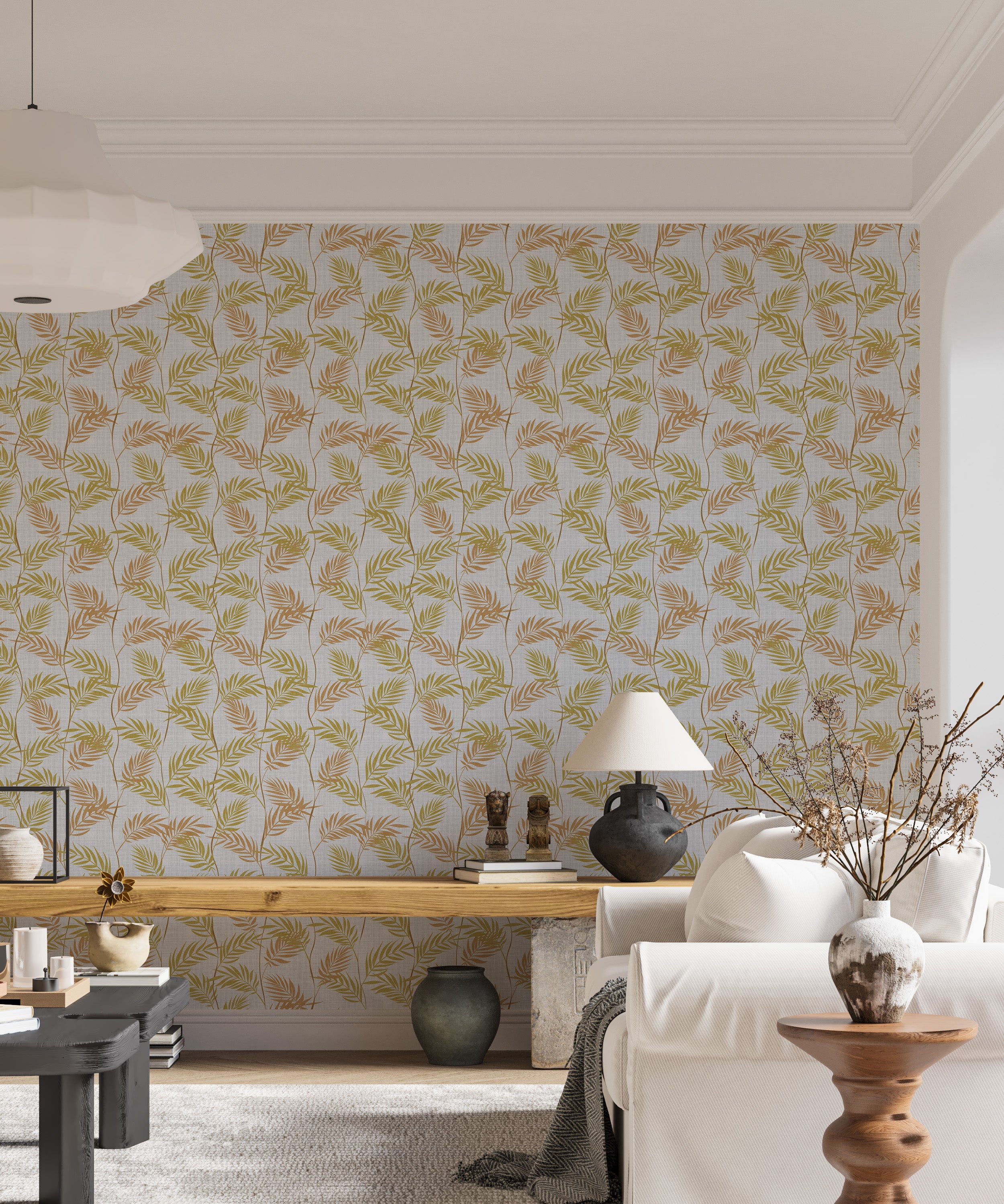 Add a touch of tropical refinement with our Elegant Palm Leaves Wallpaper. This design showcases intricately drawn palm fronds in a graceful palette of gold, charcoal, and soft gray. The subtle shimmer and flowing lines make it a stylish feature for bathrooms, hallways, or contemporary living areas. Whether you’re going for a luxe spa feel or modern oasis, this peel-and-stick wallpaper delivers lush elegance with zero fuss.