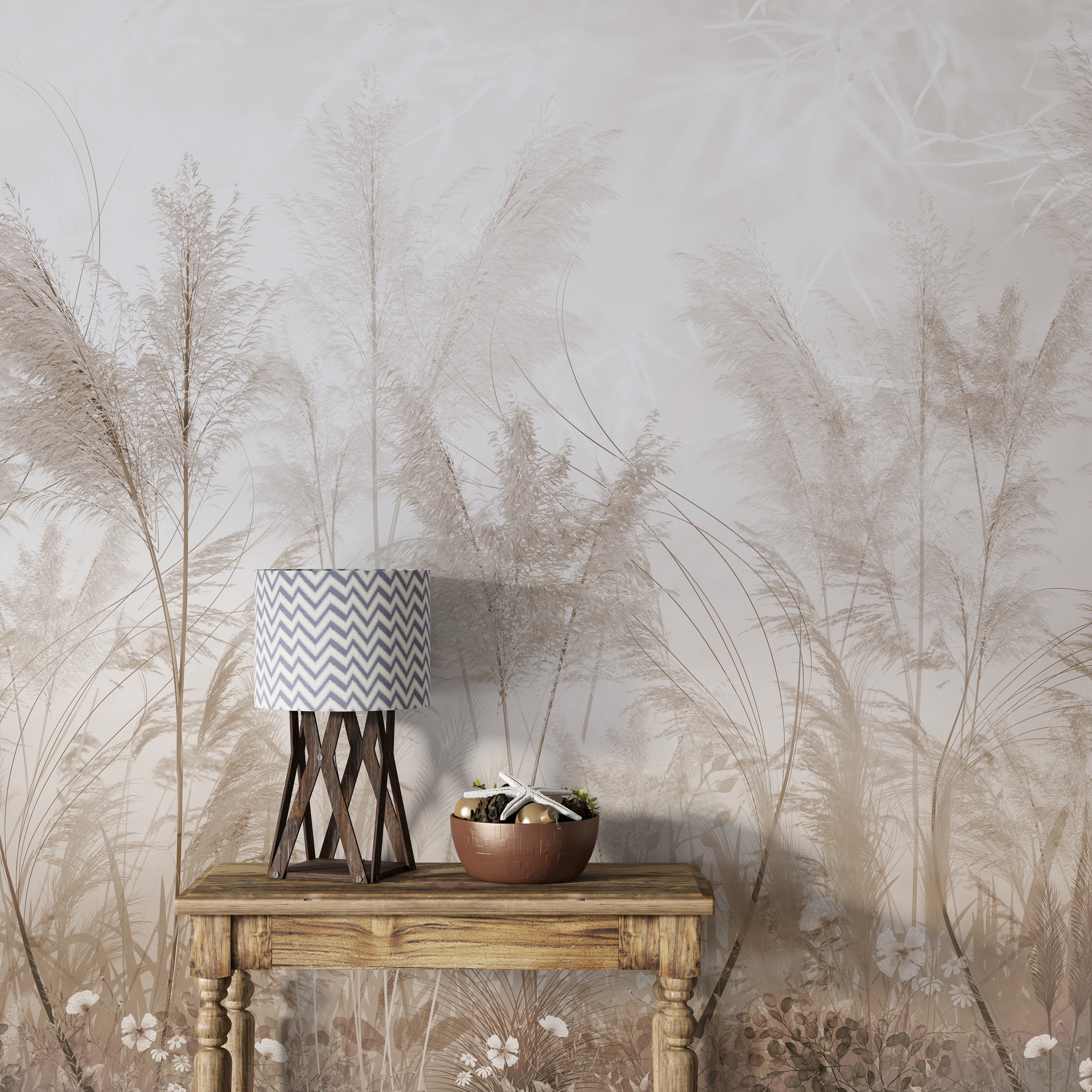 Create a tranquil and stylish space with the Elegant Pampas Grass Wallpaper Mural, designed to bring a soothing nature-inspired wall mural to your home. Featuring soft beige botanical wallpaper tones and delicate pampas grass, this design adds warmth and elegance to any room. The subtle wildflower meadow wallpaper mural creates a calming ambiance, perfect for living rooms, bedrooms, or offices. This minimalist botanical wallpaper blends seamlessly with modern, boho, and rustic interiors. Easy to install, the watercolor floral wallpaper mural transforms your space effortlessly. Elevate your walls with this misty landscape wallpaper, capturing the beauty of nature indoors.