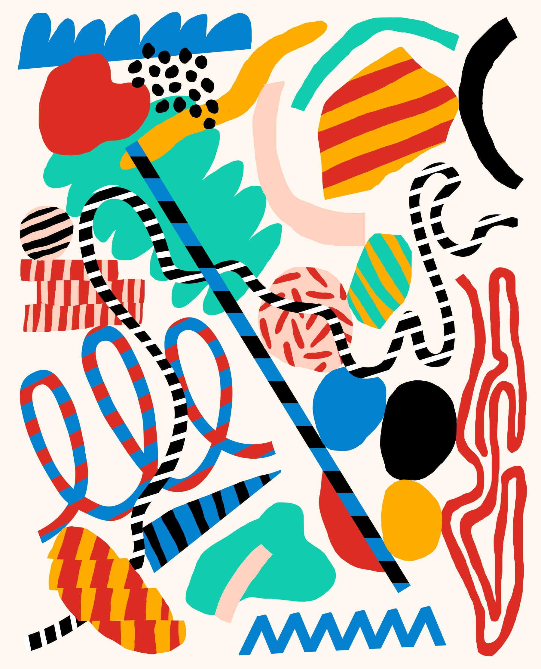 Infuse your space with the boundless energy of 'Elevate,' a vibrant abstract wallpaper designed to spark creativity and uplift your spirit. This captivating design features a playful arrangement of bold, colorful shapes and dynamic lines, creating a visual symphony that dances across your screen. Let the unexpected combinations of teal, red, blue, and yellow inject a dose of optimism and joy into your day. The black and white striped elements add a touch of playful contrast, enhancing the overall sense of movement and excitement. ‘Elevate’ is more than just a wallpaper; it's a reminder to embrace spontaneity, celebrate individuality, and rise above the ordinary. Transform your digital world into a canvas of inspiration with this contemporary masterpiece.