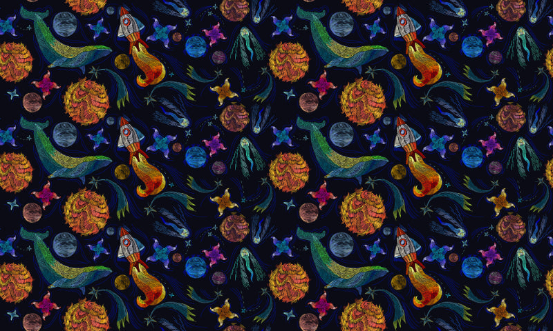 Embark on a cosmic adventure with the interstellar whales embroidery universe nursery mural wallpaper, where your child's imagination is the limit. The dark navy expanse sets the stage for a vibrant cavalcade of space wonders, from multicoloured planets to classic rocket ships leaving fiery trails in their wake. Twinkling stars dot the celestial canvas, while playful jellyfish-like creatures add a touch of whimsy with their bioluminescent glow. Comets dash across this fantastical sky, completing a dynamic scene that captivates and inspires. Perfect for a nursery, this wallpaper creates an engaging backdrop for dreams of intergalactic exploration and discovery. Dive into this enchanting universe and watch your little astronaut's eyes light up with the magic of outer space.