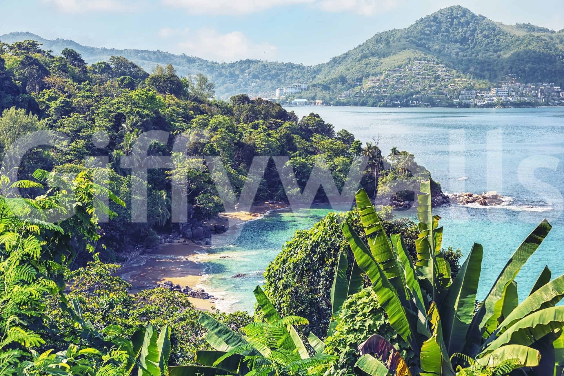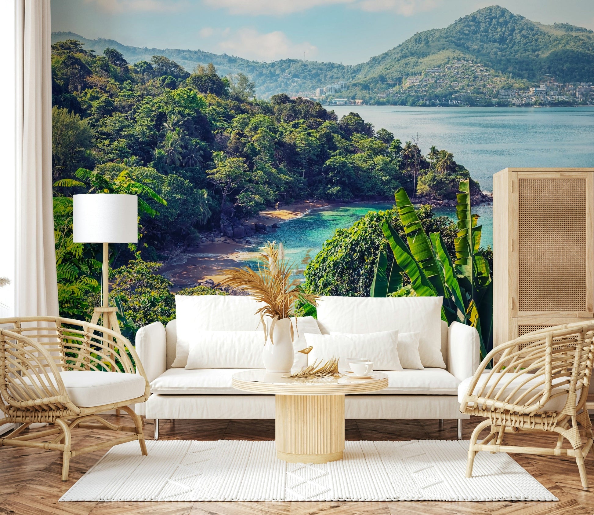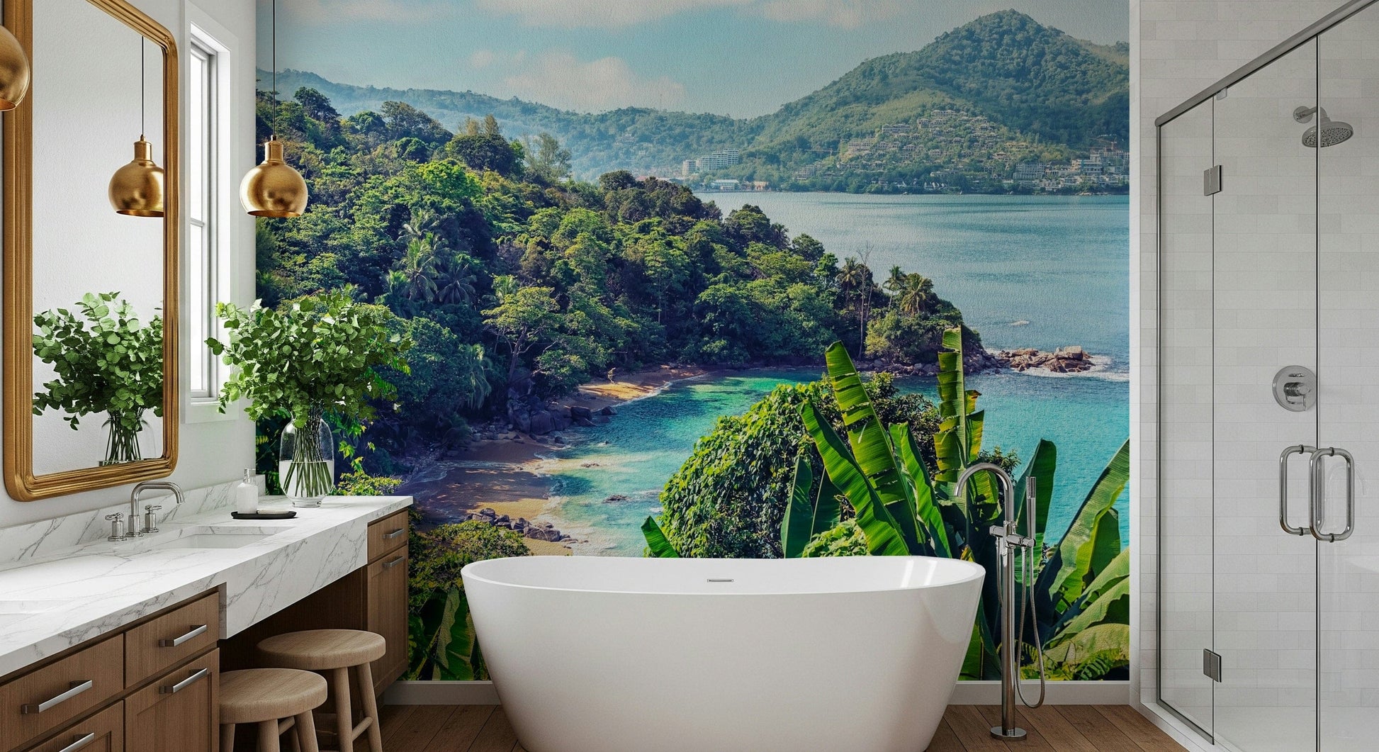 Immerse your home in the tranquil beauty of the Emerald Coast with this stunning wallpaper for walls. Picture lush, vibrant tropical foliage cascading down to meet crystal-clear turquoise waters. This striking design offers a serene escape, perfect for bedrooms, living rooms, or even creating a peaceful home office. The vivid greens and blues infuse energy and calmness, complementing both modern and bohemian decor styles. Use this wallpaper to establish a captivating feature wall, bringing depth and vibrancy to your interior space. Create a soothing sanctuary that captures the essence of a tropical paradise.