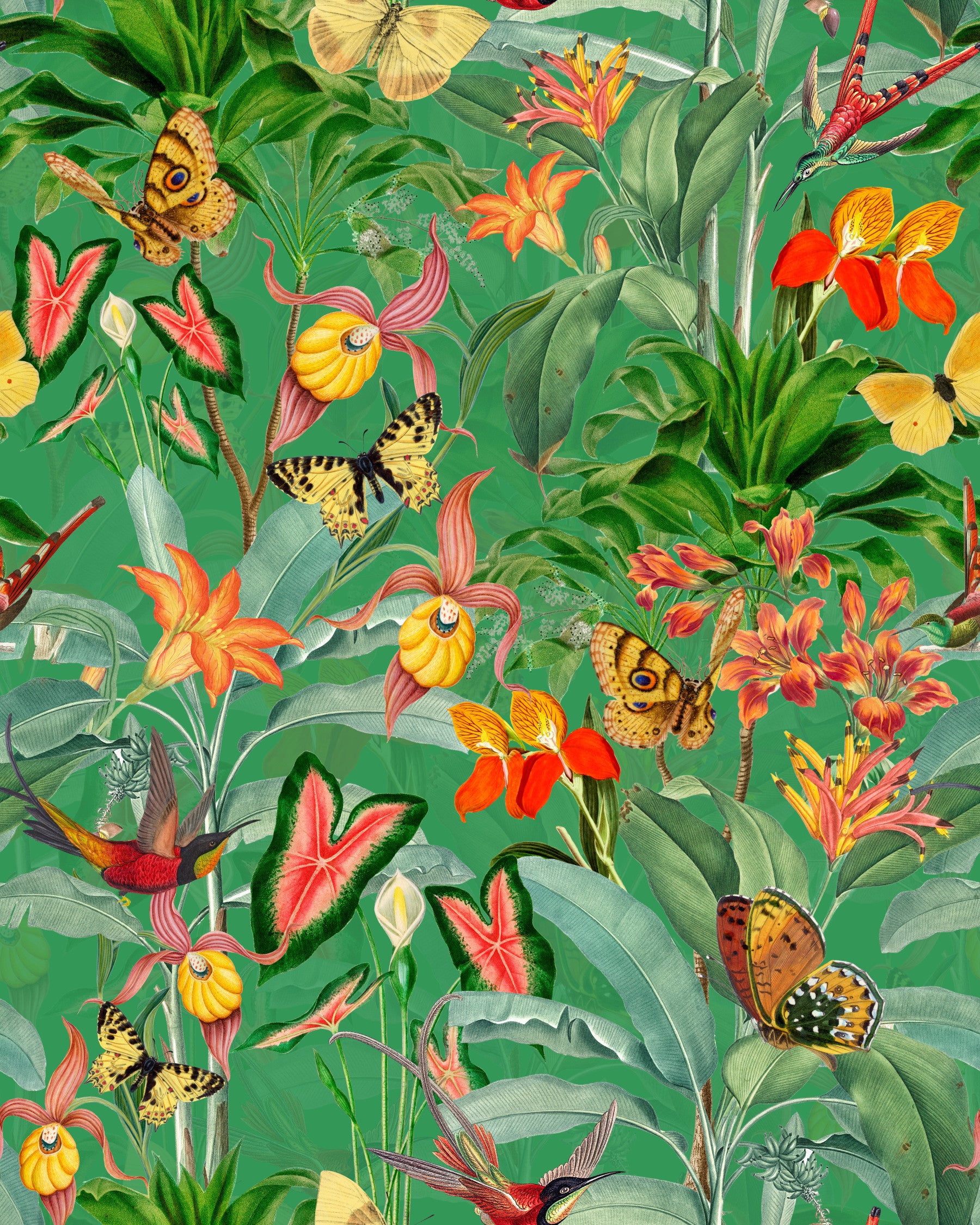 Vibrant tropical botanical wallpaper with deep emerald foliage