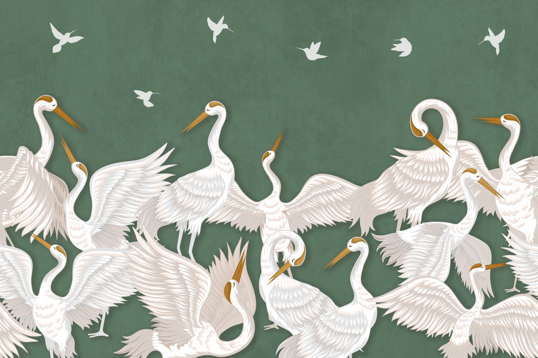 Embrace sophistication with this captivating image featuring cranes. White birds gracefully take flight against a rich, green backdrop. This design brings a touch of nature inside. The details in the bird's feathers contrast beautifully with the background color, creating a visual feast. This wallpaper for walls enlivens any space. It is perfect for a living room, dining area, or bedroom. Let your walls speak volumes with a touch of nature-inspired art.