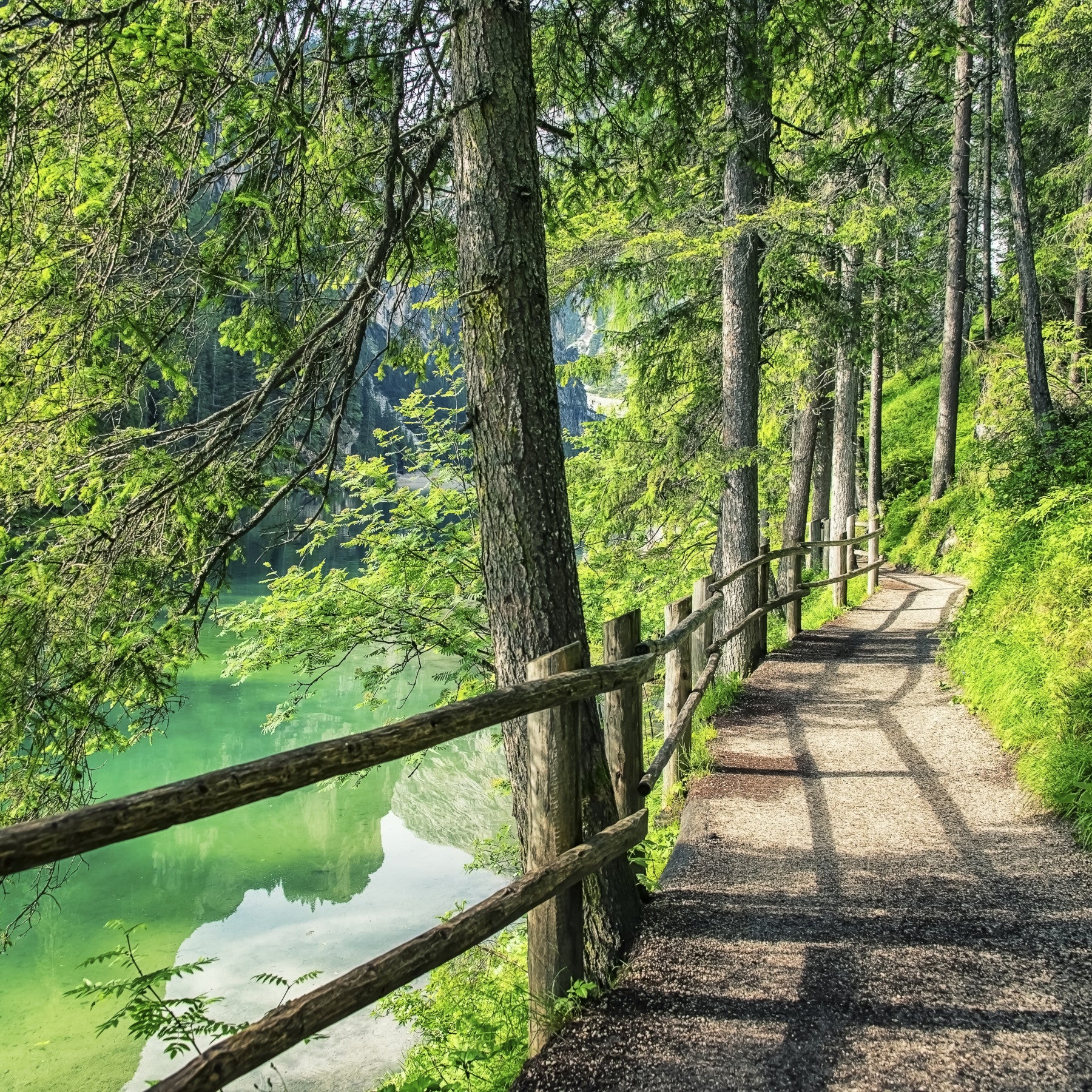 A serene pathway winds alongside a vibrant emerald lake, nestled within a lush forest. Sunlight filters through the dense canopy, casting dappled shadows on the gravel path. The crystal-clear water reflects the surrounding trees and cliffs, creating a mirror-like effect. A rustic wooden fence lines the path, adding a touch of natural charm. This wallpaper evokes a sense of tranquility and invites you to escape into the peaceful embrace of nature. The image is perfect for those who appreciate the beauty of natural landscapes and seek a calming and restorative atmosphere in their home or workspace.