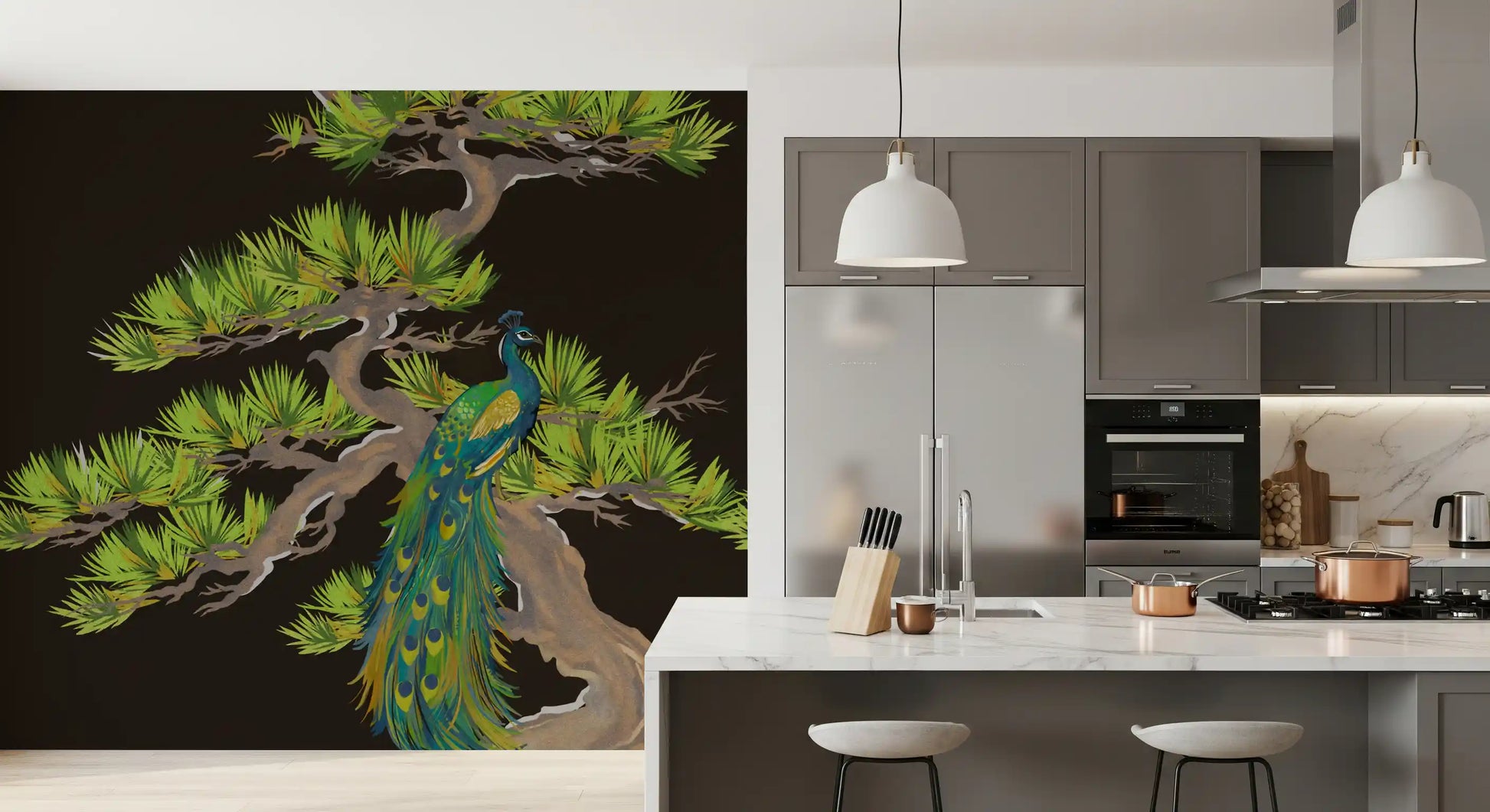 Transform your living space with this striking wallpaper for walls, showcasing a majestic peacock perched gracefully on an ancient, gnarled pine tree. The intricate illustration style brings the exotic beauty of nature directly into your home. A vibrant palette of emerald green, deep teal, and golden accents from the peacock’s feathers shines against the rich, dark brown background. Lush, textured greens of the pine needles beautifully complement the earthy tones of the tree trunk. This design creates a dramatic focal point, adding a touch of sophisticated artistry to any room. It works beautifully in a grand living room, an elegant dining room, a serene bedroom, or as a captivating accent in a hallway, infusing your interior with timeless charm and natural allure.