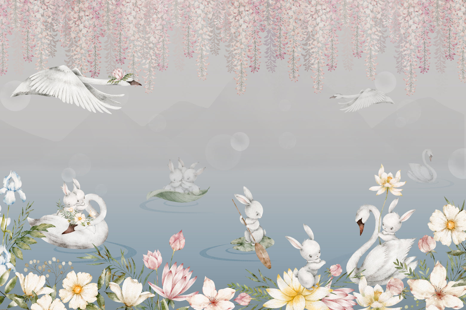 Create a magical atmosphere with enchanted bunny swan lake wallpaper. Gentle swans glide across a peaceful lake, carrying playful bunnies among blooming flowers. Soft pastel tones and delicate watercolor details bring a fairy tale charm to nurseries and children's rooms. Hanging wisteria adds a dreamy effect, making walls look serene and inviting. The combination of graceful swans, adorable rabbits, and floral beauty creates a soothing environment. Perfect for creating a cozy retreat, this design enhances walls with elegance. Ideal for a nature-inspired setting, this wallpaper captures the innocence and wonder of childhood while offering a timeless and graceful look.