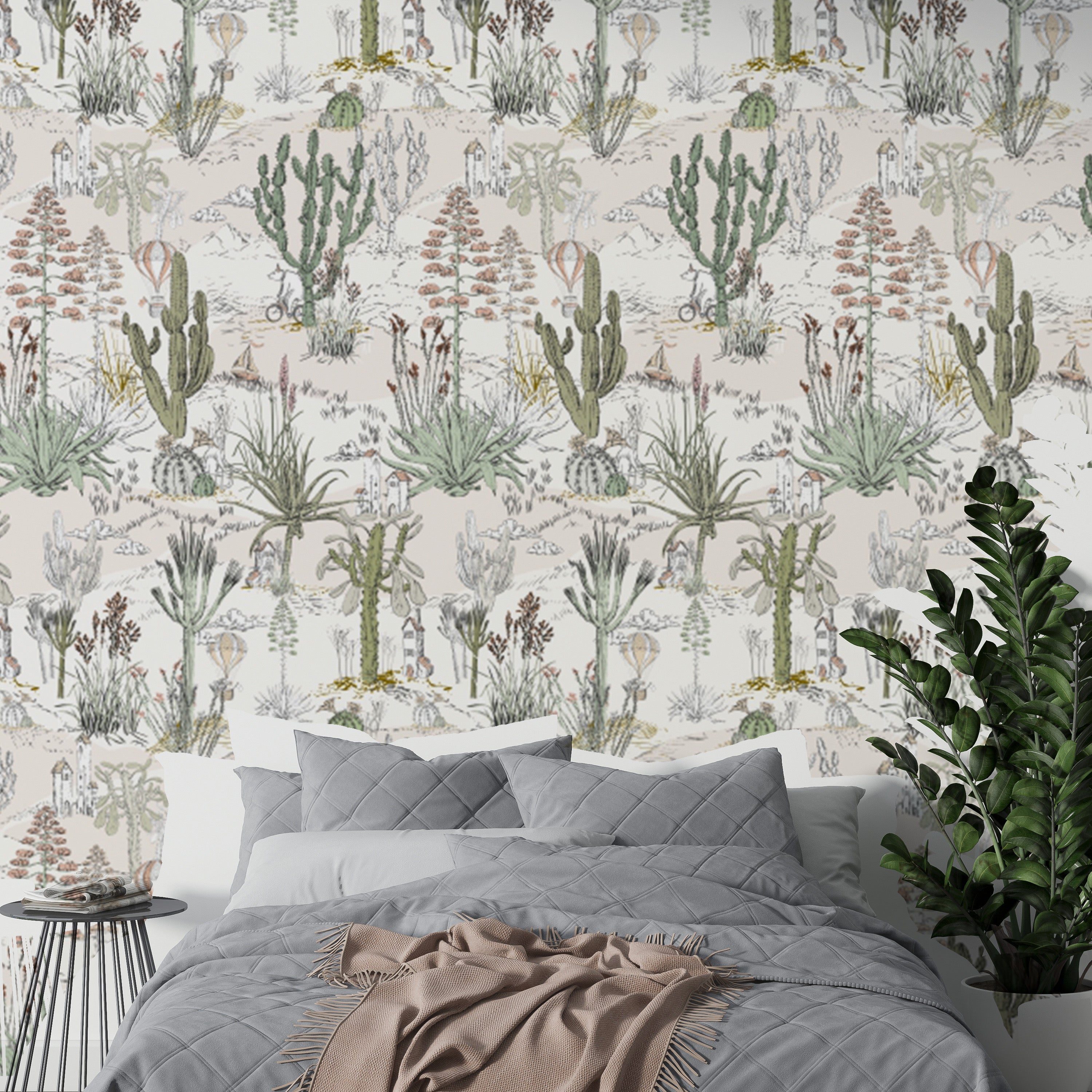 Enchanted cactus wallpaper with soft desert hues for your home.