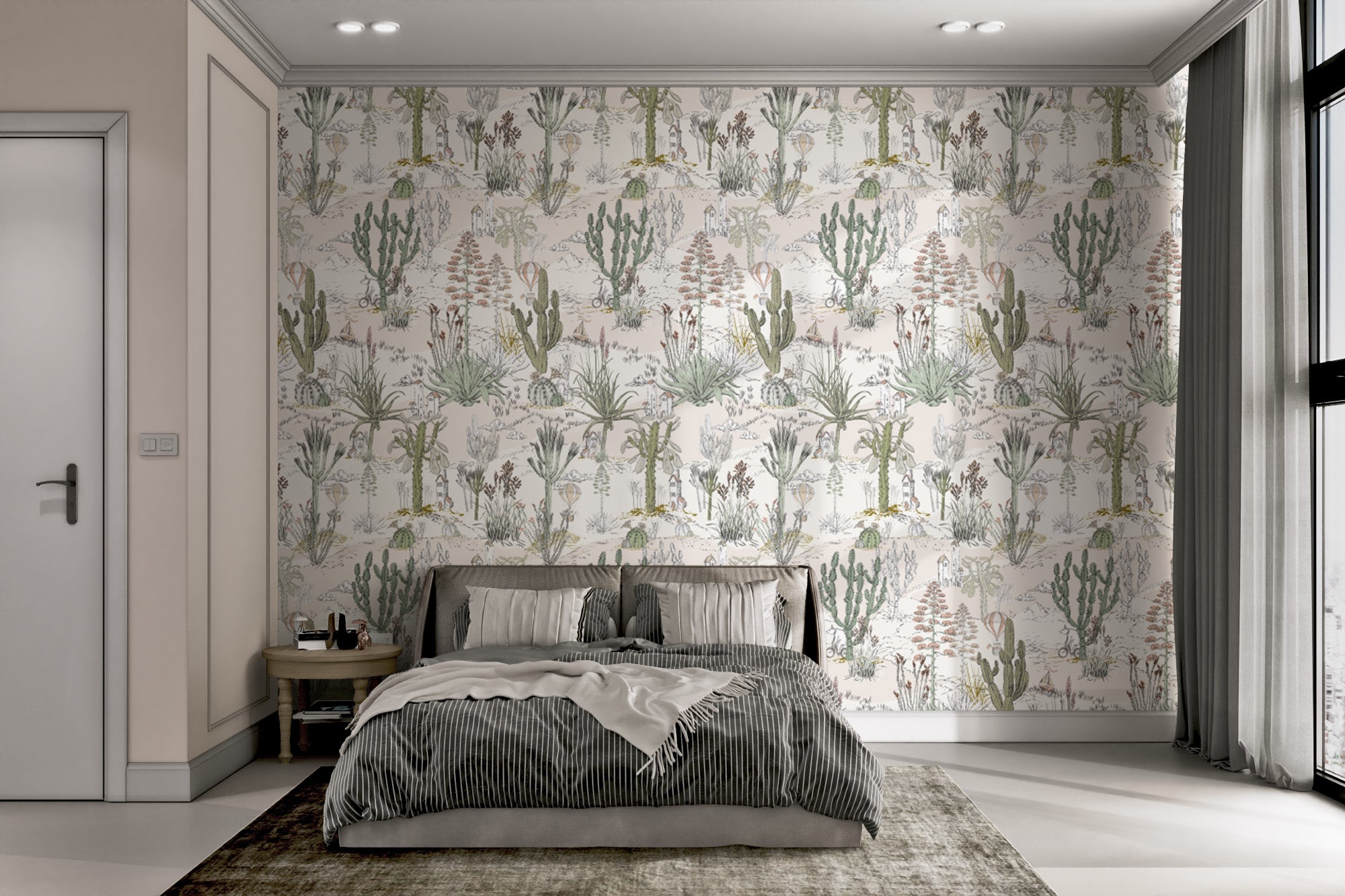 Dreamy cactus-themed wallpaper for enchanted interior spaces.