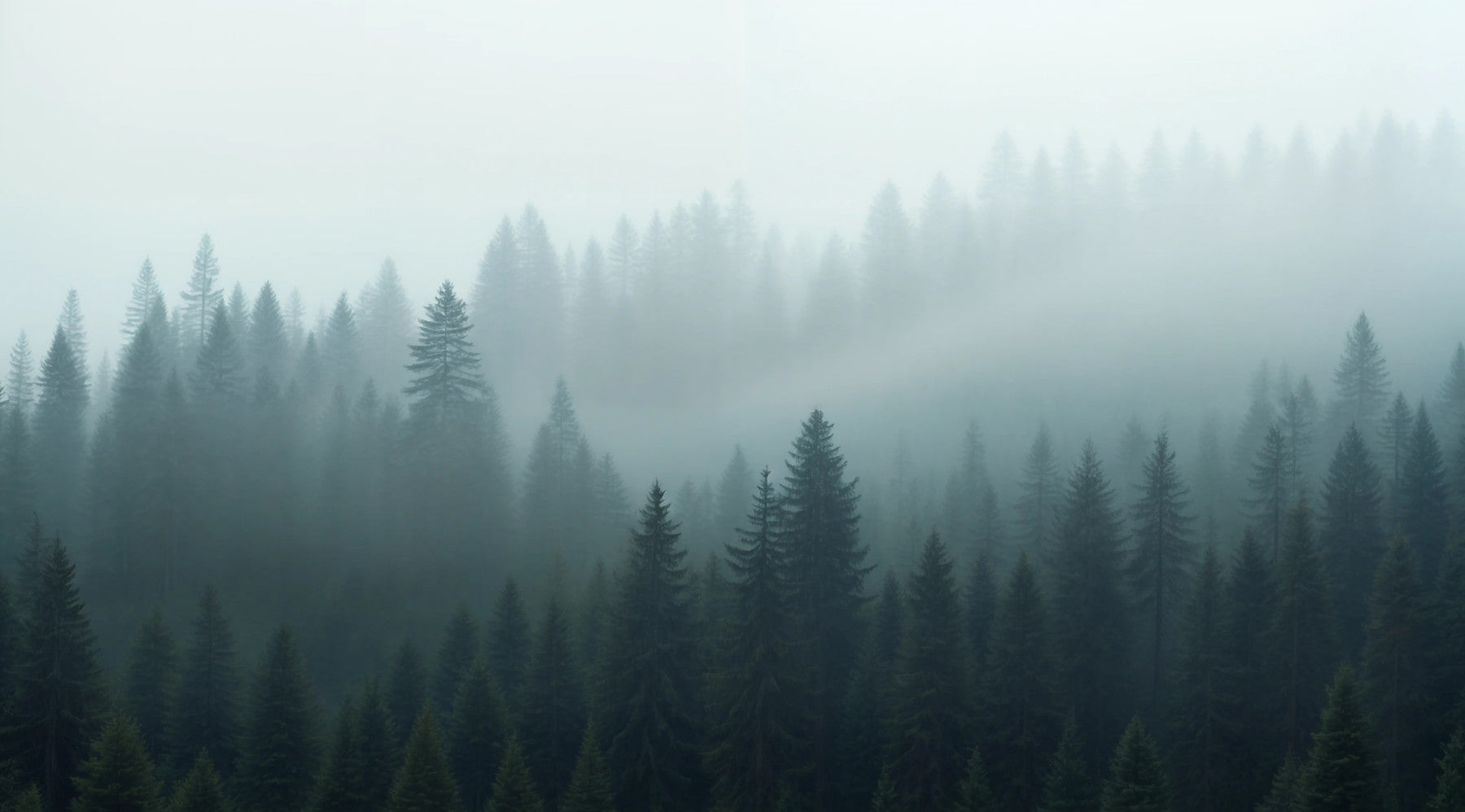 Escape to an enchanted world with this captivating forest wallpaper. The image portrays a dense evergreen forest shrouded in a mysterious fog, creating an atmosphere of quiet magic. The deep greens and blues of the trees are softened by the hazy mist, adding an element of dreamlike wonder. Perfect for those seeking a serene and slightly mysterious atmosphere, this wallpaper will transport you to a world of tranquility and quiet beauty. Let the enchanted forest bring a touch of magic to your screen.