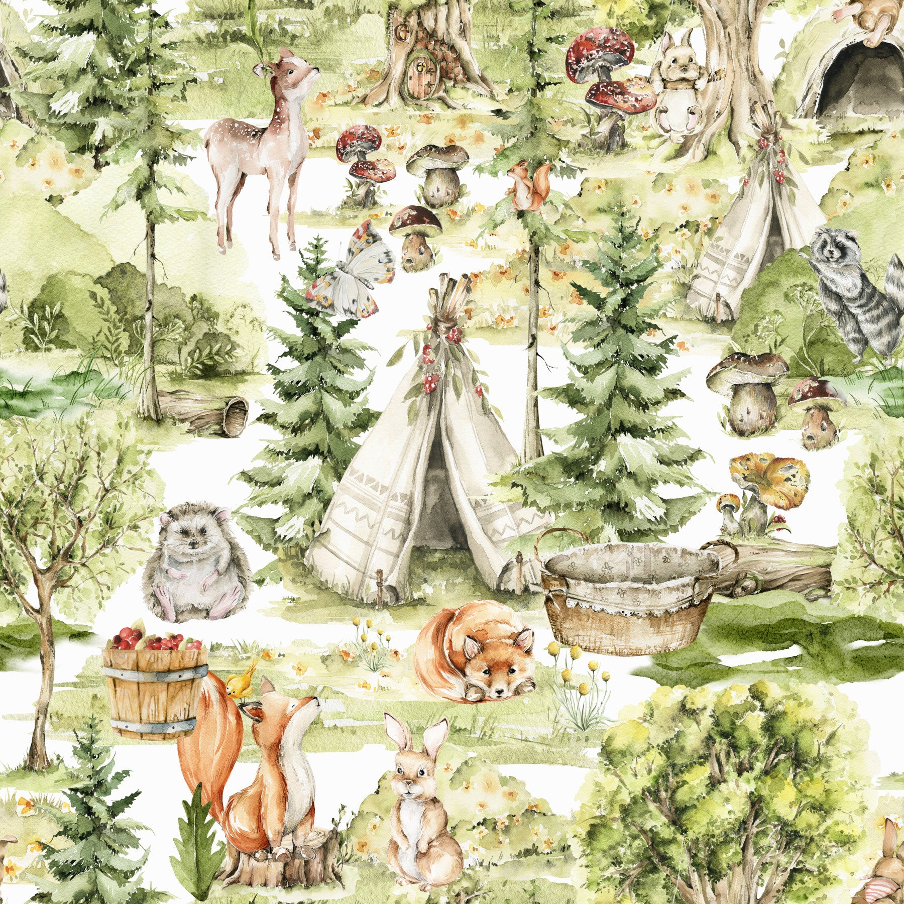 Step into the whimsical world of Enchanted Forest Tales, where sweet foxes, gentle deer, and hidden bunnies gather among cozy teepees and vibrant flora. This captivating design captures the vibrant feel of a secret woodland haven, perfect for inspiring imagination in a nursery or playroom. Let your child's room be a magical adventure! The soft, artistic style of this premium wallpaper for walls creates an inviting atmosphere. For simple installation, our popular peel and stick wallpaper option is ideal. Alternatively, choose the striking wallpaper mural format to create an immersive scene. Give your little one a storybook setting to enjoy—shop this enchanting design today.