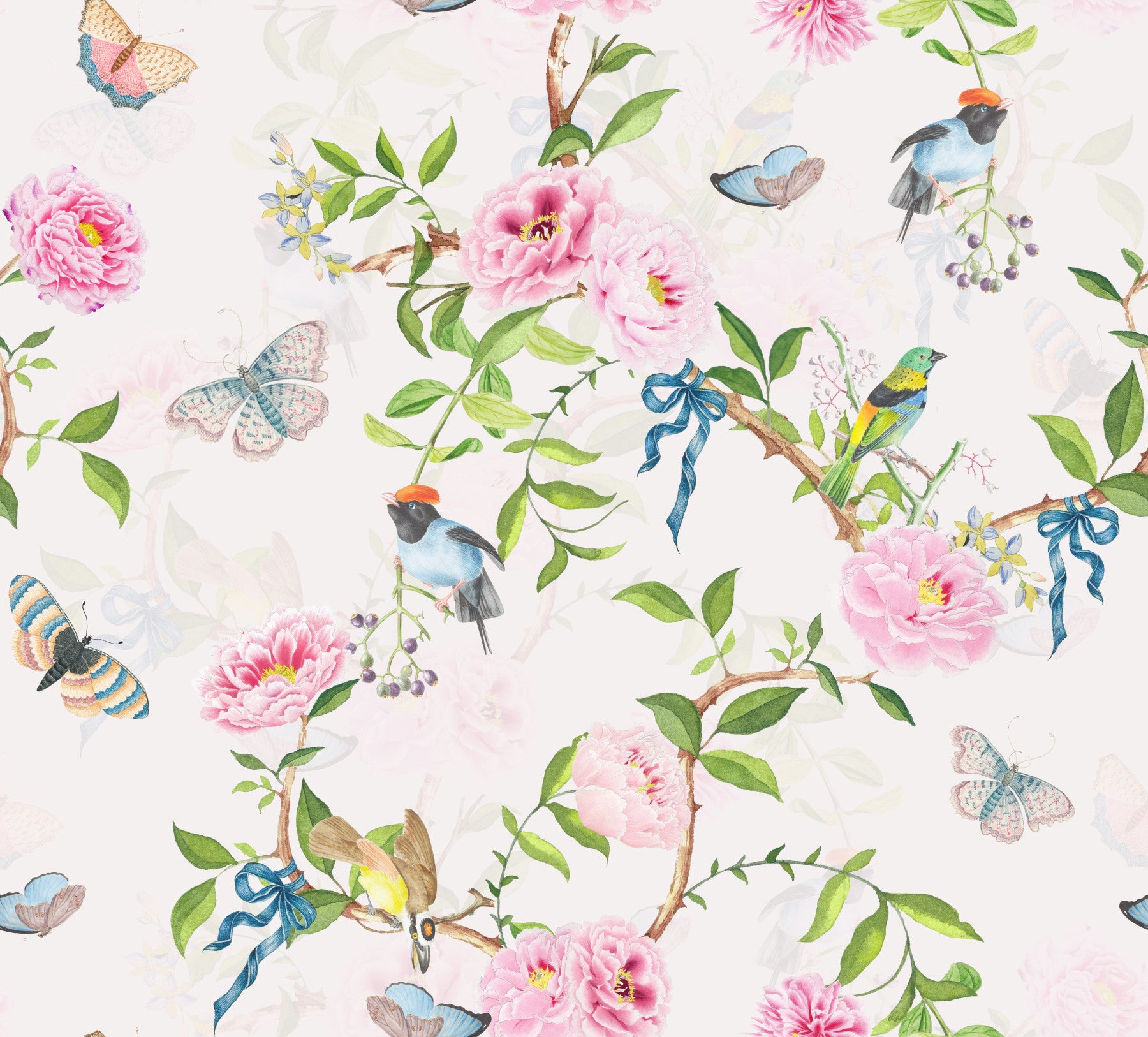 Escape to an enchanted garden with this captivating wallpaper. The design features a harmonious blend of watercolor-painted pink peonies, delicate butterflies in soft hues, and vibrant birds perched on gracefully curved branches. Blue ribbons add a touch of playful elegance, while the soft, pastel palette creates a calming and serene atmosphere. This wallpaper is ideal for transforming any space into a haven of tranquility, perfect for bedrooms, nurseries, or any room where a touch of whimsical beauty is desired. Its versatility makes it suitable for a range of design styles, adding a touch of magic to your home décor.