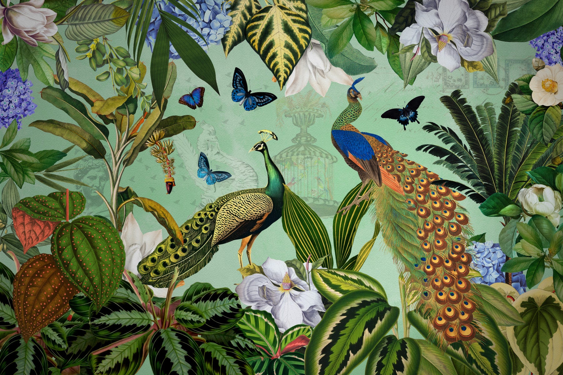 Escape to an enchanted garden with this breathtaking wallpaper. Intricate botanical illustrations and two stunning peacocks create a scene of serene beauty. Delicate butterflies dance among vibrant blooms and lush leaves, adding a touch of whimsy to the design. The soft mint green background enhances the overall tranquility, making it perfect for bedrooms, living rooms, or any space needing a calming and sophisticated touch. The wallpaper's blend of classic botanical art and vibrant colors creates a space that is both elegant and full of life.