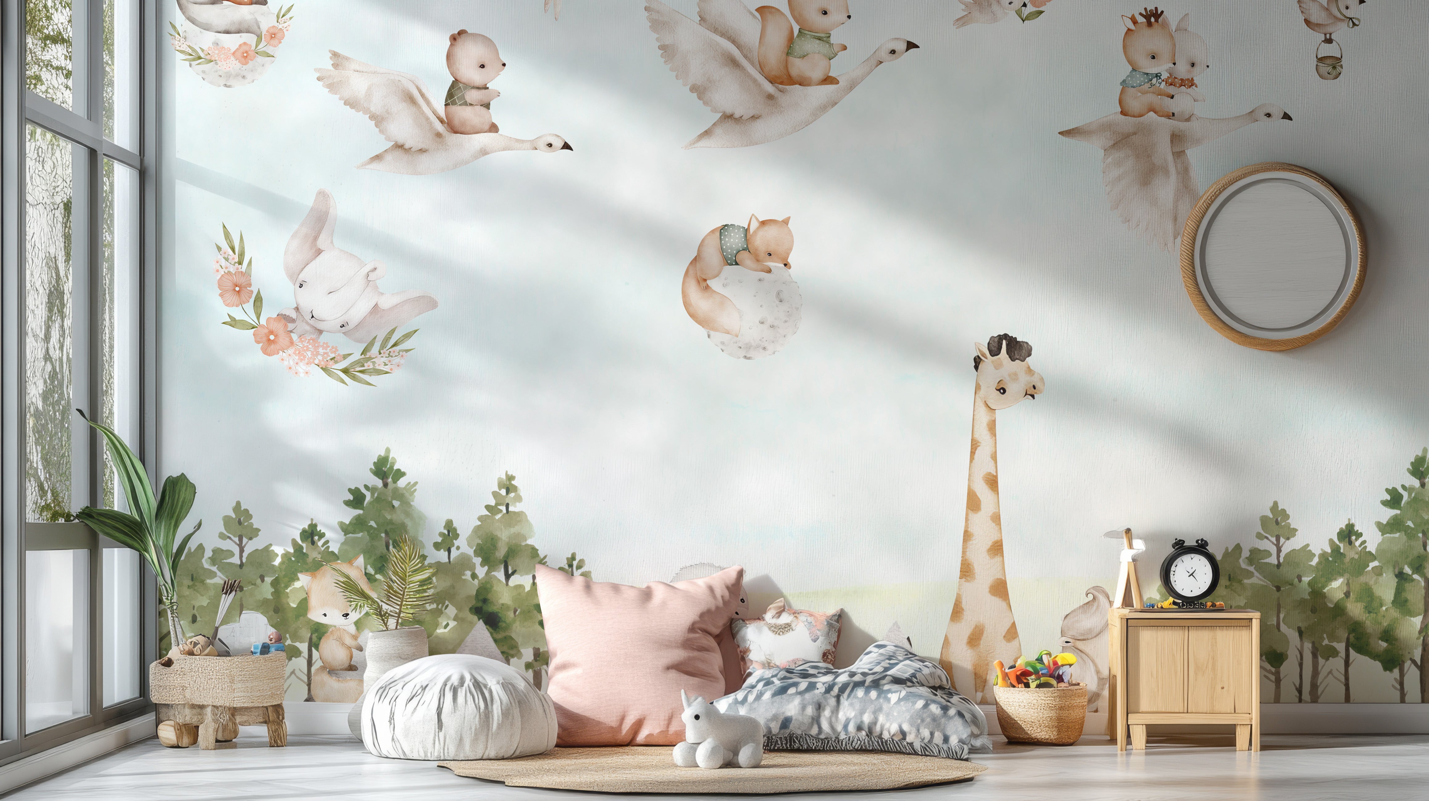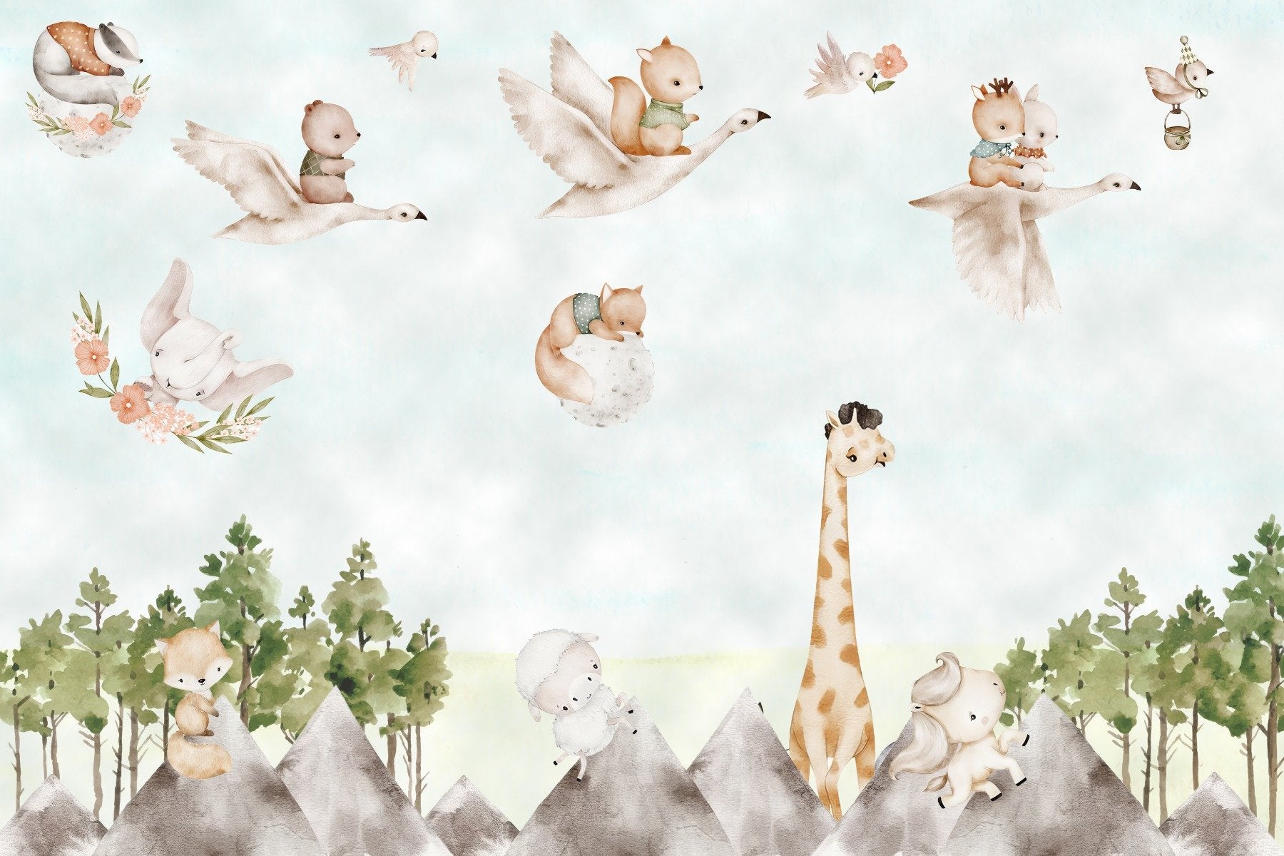 The enchanted woodland creature mural is a captivating addition to any child's room, offering a glimpse into a world of imagination and playfulness. This charming playroom wallpaper is filled with whimsical animal friends, from gentle giraffes to frolicsome foxes, all beautifully rendered in soft watercolor tones. Perfect as a nursery wallpaper, it creates a soothing yet engaging environment for the little ones to grow up in. Each creature in this cartoon animal wallpaper has been crafted with care, inviting stories and dreams to unfold against a backdrop of serene skies and gentle peaks. It's a scene that encourages wonder and joy in kids room wallpaper design, making every bedtime or playtime an adventure into the enchanted forest.