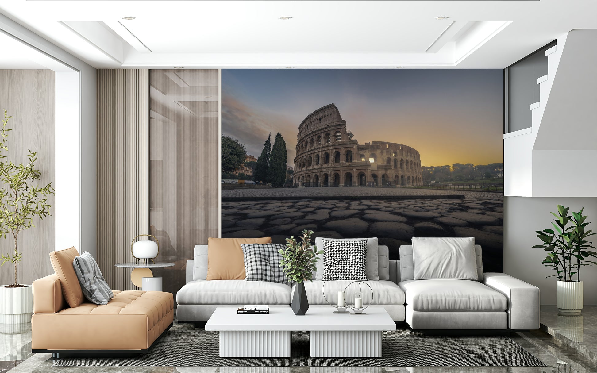 Experience the majesty of the Colosseum with this stunning wallpaper for walls. The image captures the ancient arena in Rome against a serene sunrise sky. Its neutral stone hues contrast beautifully with the soft blues and gold of the dawn, making it suitable for living rooms, dining rooms, or home offices. This design adds a touch of history and architectural wonder to interiors and it works well as an intriguing backdrop, creating a cultured ambience.