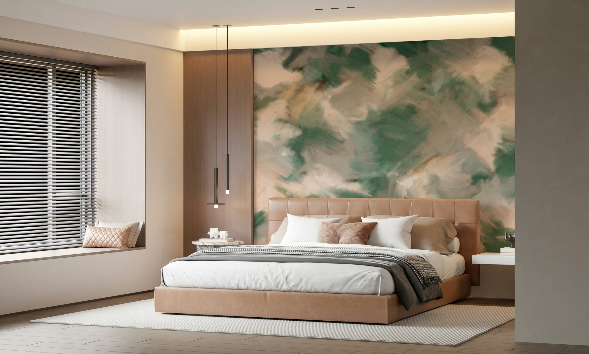 This abstract wallpaper for walls brings a soft, painterly touch to any space. Swirling greens and neutral tones create a sense of calm and serenity. The design works well in living rooms, bedrooms, or hallways, adding a subtle artistic accent. See how this design complements your interiors and makes every space feel sophisticated, elegant, and chic. The textured look adds depth and visual interest.