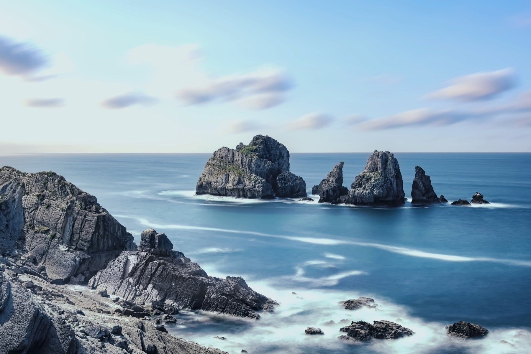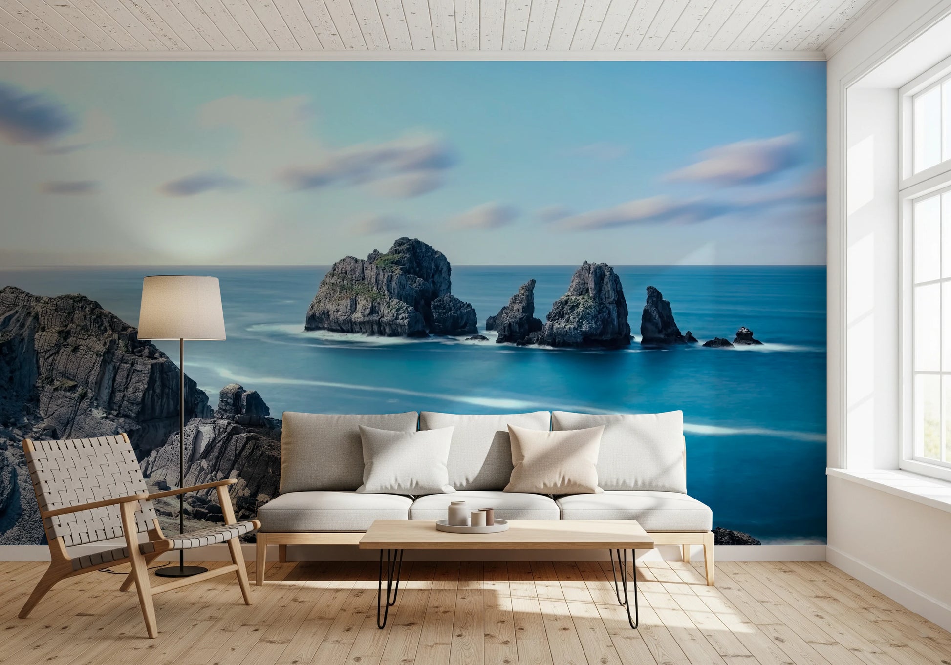 Transform your walls into a serene coastal escape with this stunning wallpaper for walls. The design highlights the rugged beauty of a rocky coastline as it meets a tranquil sea. The long exposure technique creates a hazy, dreamlike effect. Dominated by cool blues, greys, and off-whites, the palette imparts an atmosphere of peace. This wallpaper is ideal for bedrooms, bathrooms, or hallways, instantly creating a calming and stylish environment. It enhances interiors by adding depth, texture, and a touch of natural drama.