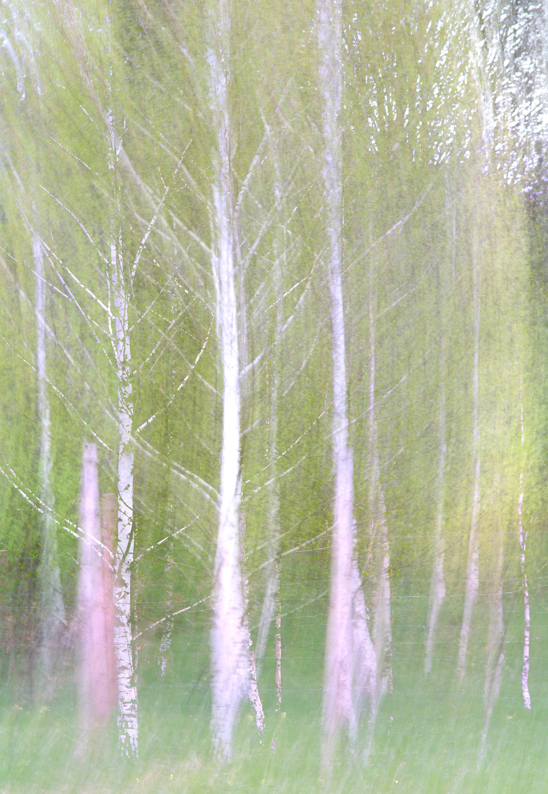 This captivating piece presents a serene view of birch trees, enveloped in a soft, ethereal blur. The gentle greens and subtle pinks create a tranquil atmosphere, perfect for any space seeking a touch of nature's beauty.