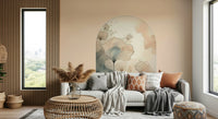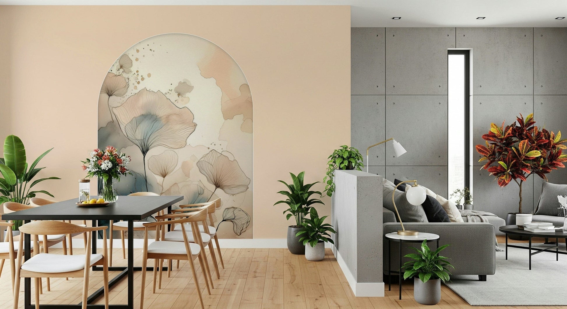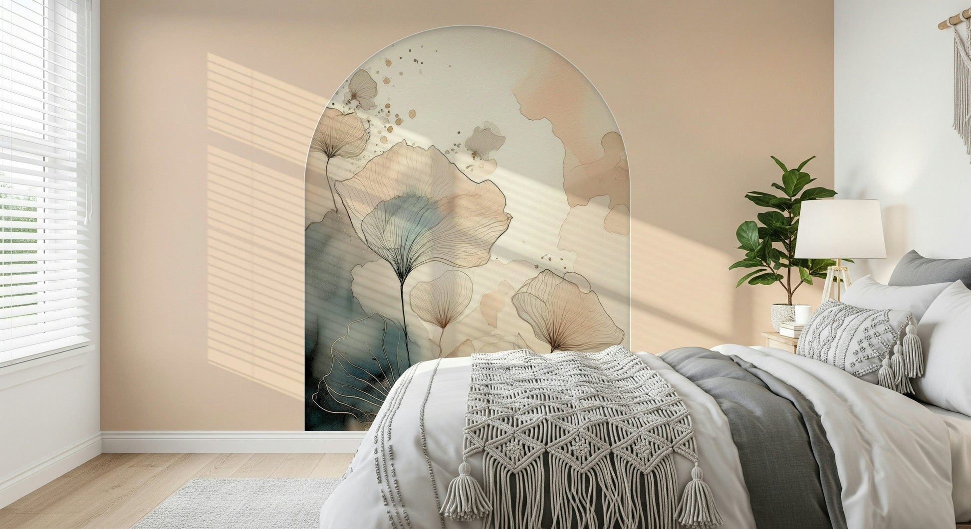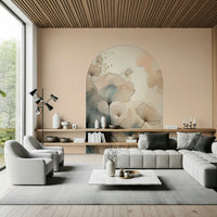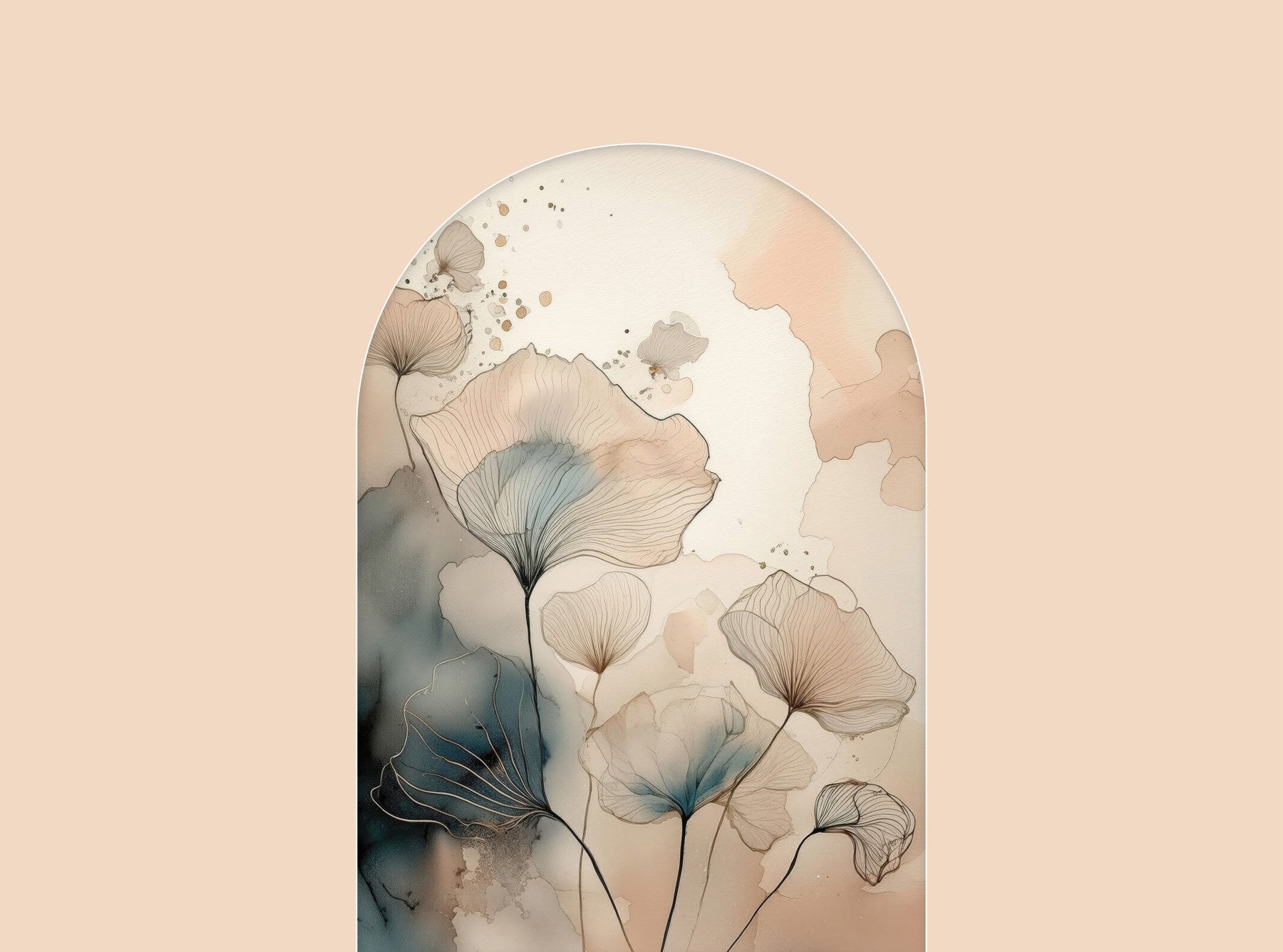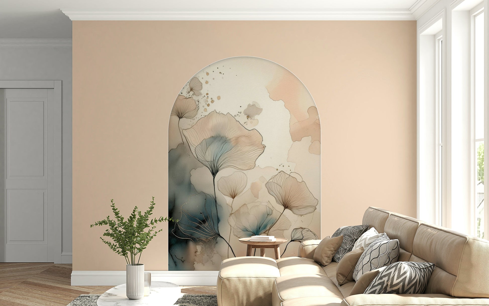 Bring delicate floral artistry to your home with this arched wallpaper design. Watercolour flowers bloom within the frame, creating a soft and inviting atmosphere. Notice how the light pink, beige, and blue colours blend together gently. It creates wonderful wallpaper for walls in living rooms, bedrooms, or even a calming bathroom. This mural easily complements interiors and delivers a refined touch to any room.