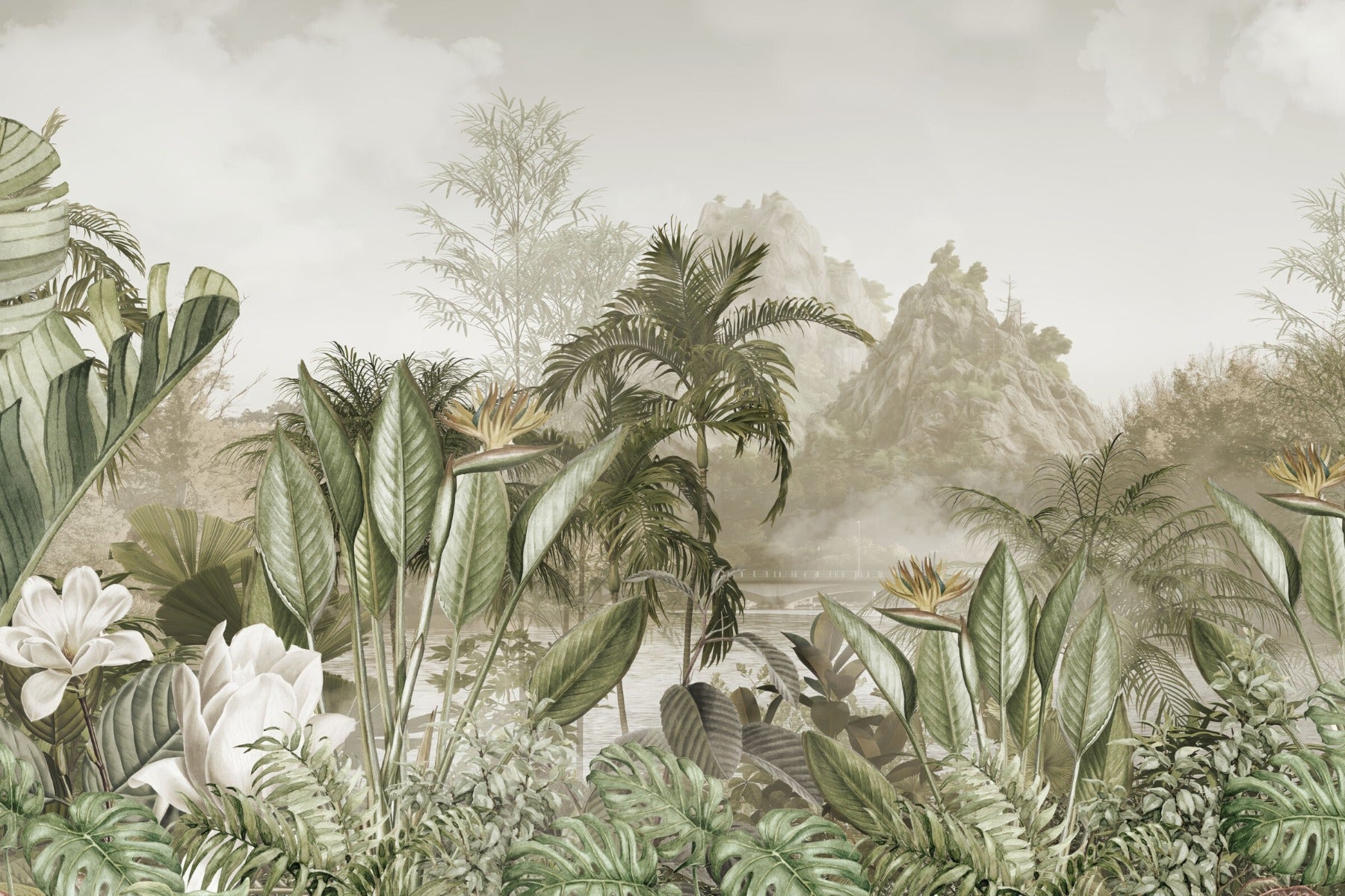 Serene ethereal jungle panorama mural wallpaper for living room walls.