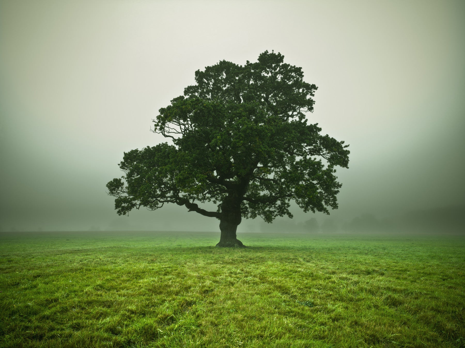 Single Tree in mist and fog. Immerse yourself in the captivating aura of "Ethereal Presence," a wallpaper that evokes a sense of tranquil mystery and profound serenity. A solitary, majestic tree stands sentinel in a verdant field, its silhouette softened by a dense, atmospheric mist. The muted tones of green and grey create a dreamlike quality, transforming your screen into a window to a world where nature reigns supreme and whispers secrets to the wind. This image captures the essence of stillness, inviting you to pause, breathe, and connect with the quiet beauty that surrounds us. Let the calming influence of this solitary oak and the soft embrace of the ethereal fog wash over you, bringing a moment of peace to your digital world and reminding you of nature's enduring strength and gentle power. Transform your device into a sanctuary of serenity with this captivating landscape.