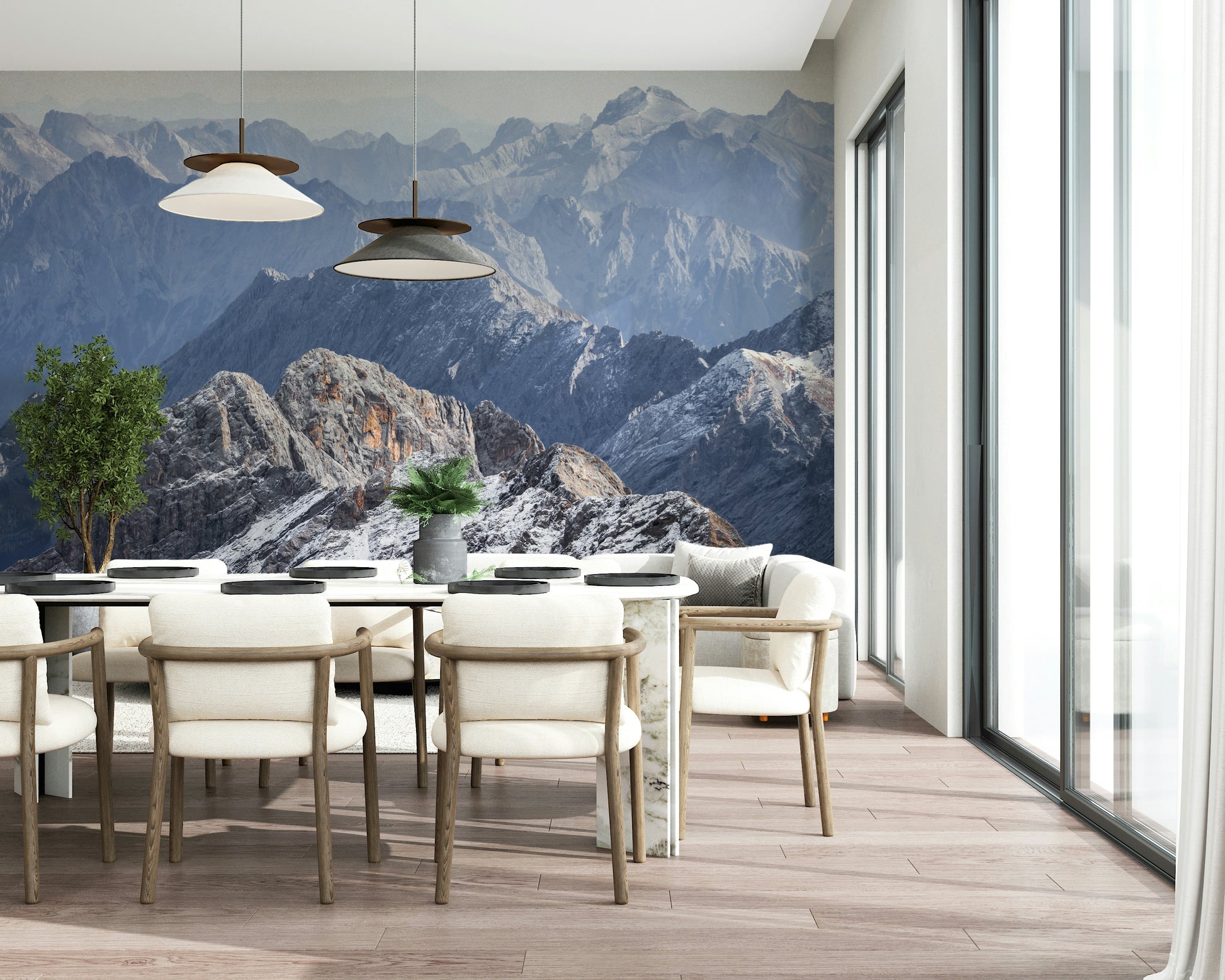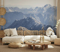 Bring a sense of airy beauty to your interiors with this landscape. This wallpaper for walls offers a breathtaking view of distant mountains in muted tones of blue and grey. Ideal for a bedroom, study, or any space where a calming atmosphere is valued. The design features a subtle, dreamlike quality that pairs well with light wood furniture and neutral colour schemes. Its understated elegance makes it perfect for creating a tranquil escape.