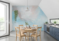 This beautiful abstract wallpaper brings serene calm to any room. Painterly brushstrokes create a gentle, textured surface, mimicking a soft art canvas. Its ethereal style features a soothing colour palette of sky blues, pristine whites, and delicate blush accents, blending seamlessly across the design. This elegant wallpaper works perfectly in bedrooms, promoting relaxation, or in living rooms and nurseries to establish a peaceful ambience. Consider it for quiet reading nooks or serene home offices. It enhances interior spaces by introducing a sophisticated yet understated artistic touch, inviting tranquillity and visual lightness into your home. The fluid blend of colours offers a soft, expansive feel, making rooms feel more open and airy.