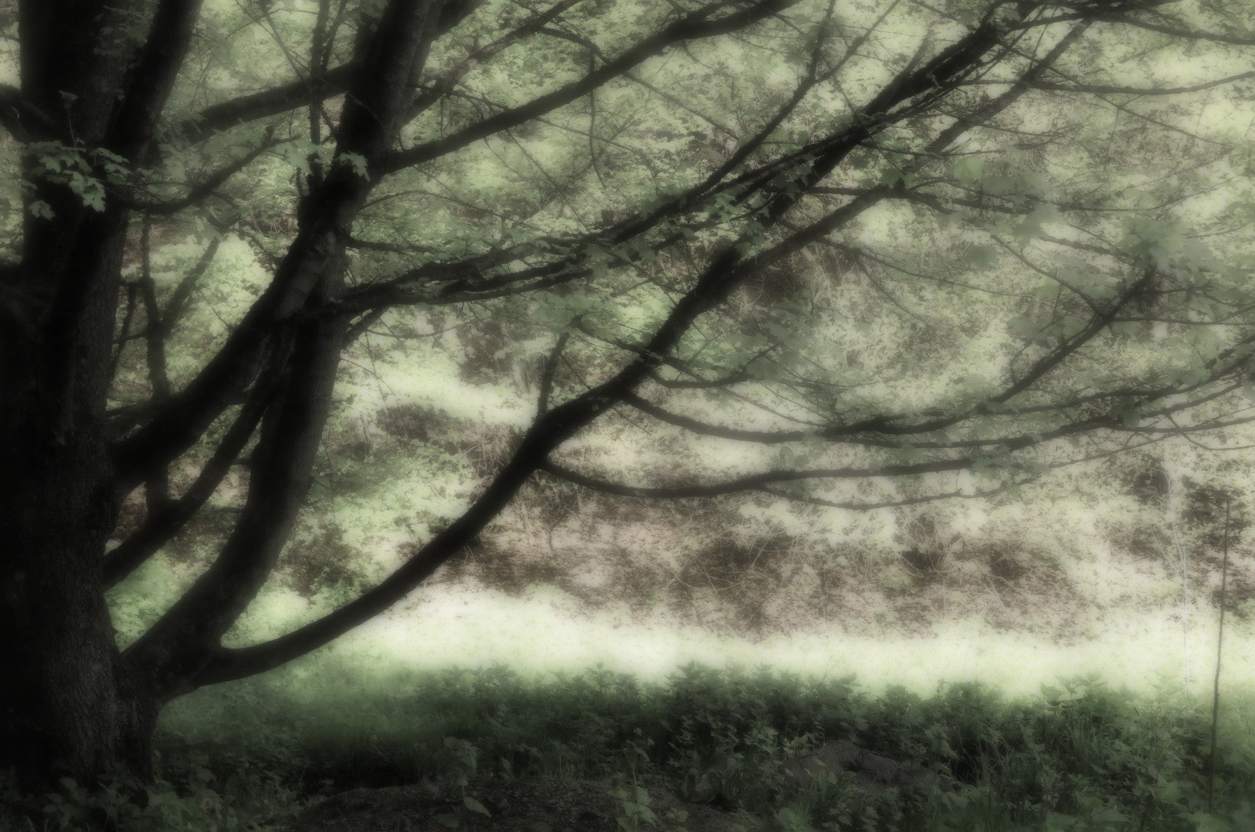 This ethereal art print presents a tranquil scene of a tree enveloped in soft greens, inviting a sense of calm into your space. The delicate interplay of light and shadow reveals the intricate details of the branches, creating a soothing atmosphere perfect for any room.