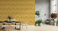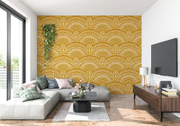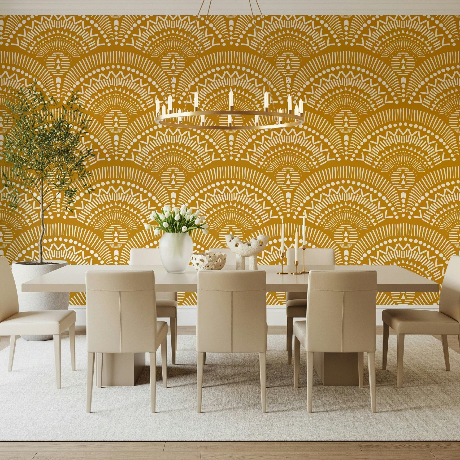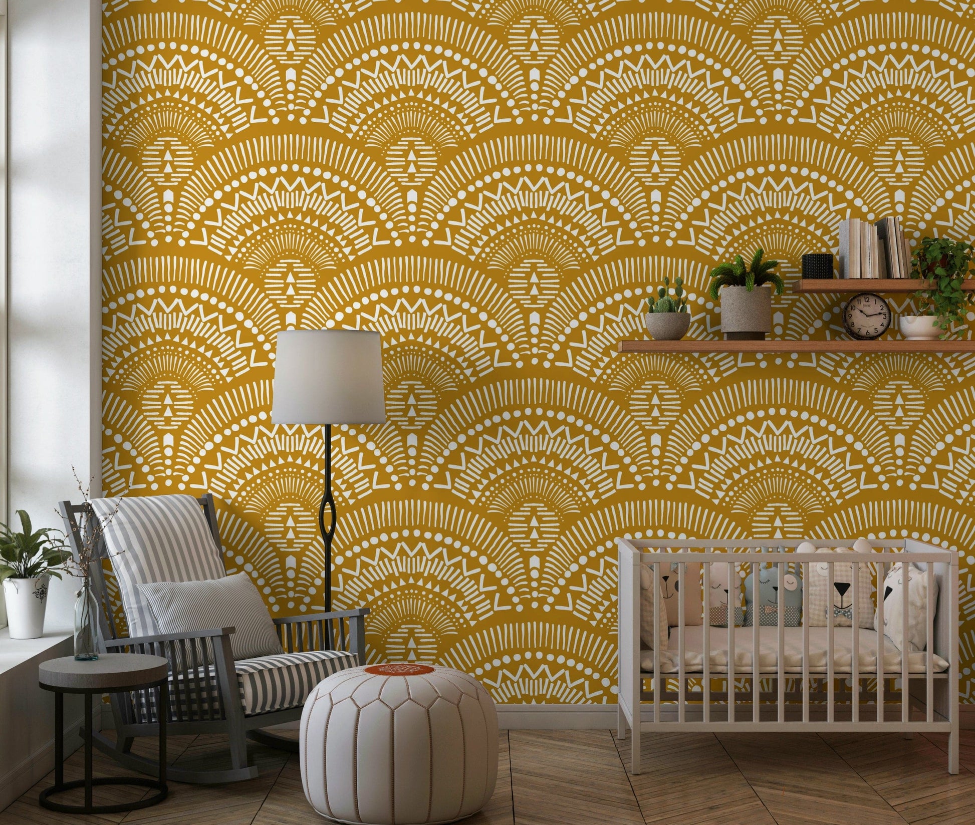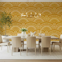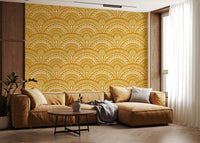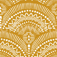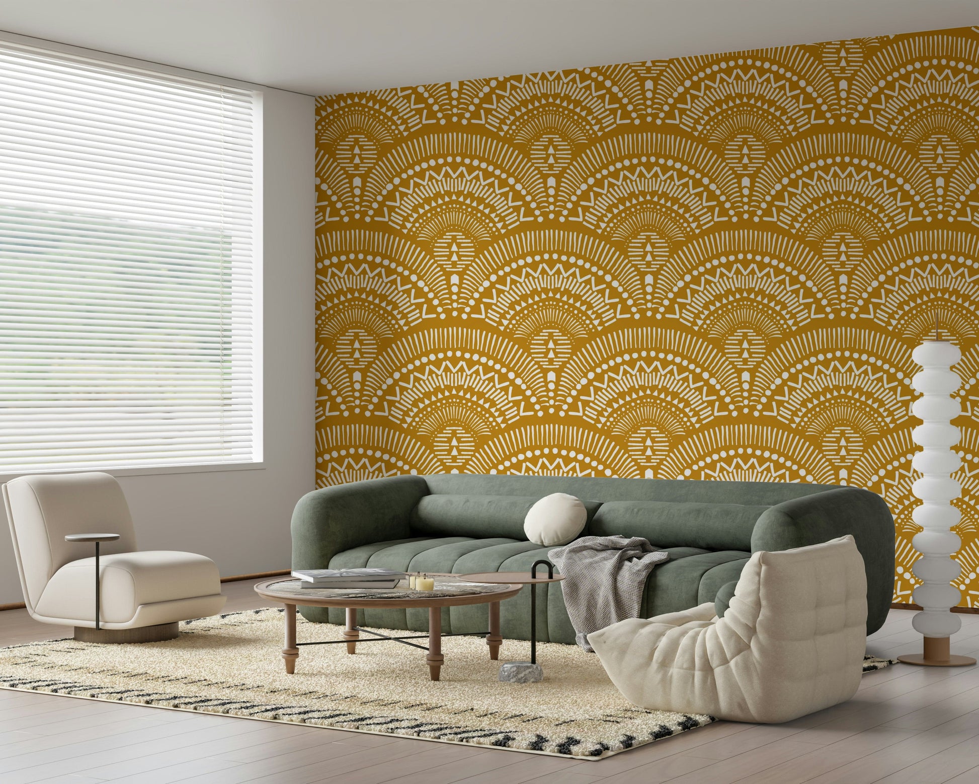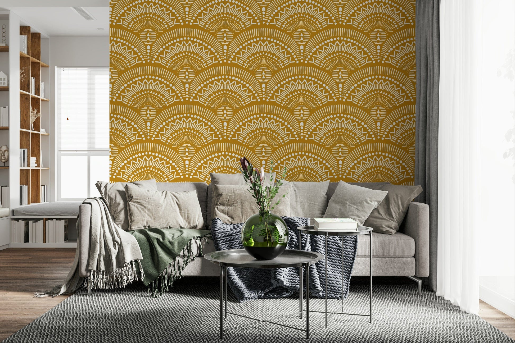 Evoke cultural charm with Ethnic Echoes wallpaper for walls. This striking pattern features a series of white geometric motifs set against a bold ochre canvas. The design creates a global vibe, making it ideal for a bohemian-inspired living room or a globally-themed home office. Picture it brightening a hallway or infusing an entryway with character. The rhythmic arrangement of shapes adds an artistic touch, complementing both modern and rustic interior styles. Let this wallpaper enrich your walls, transforming any space into a captivating display of cultural expression. The earthy colour palette enhances comfort and cosiness.