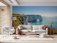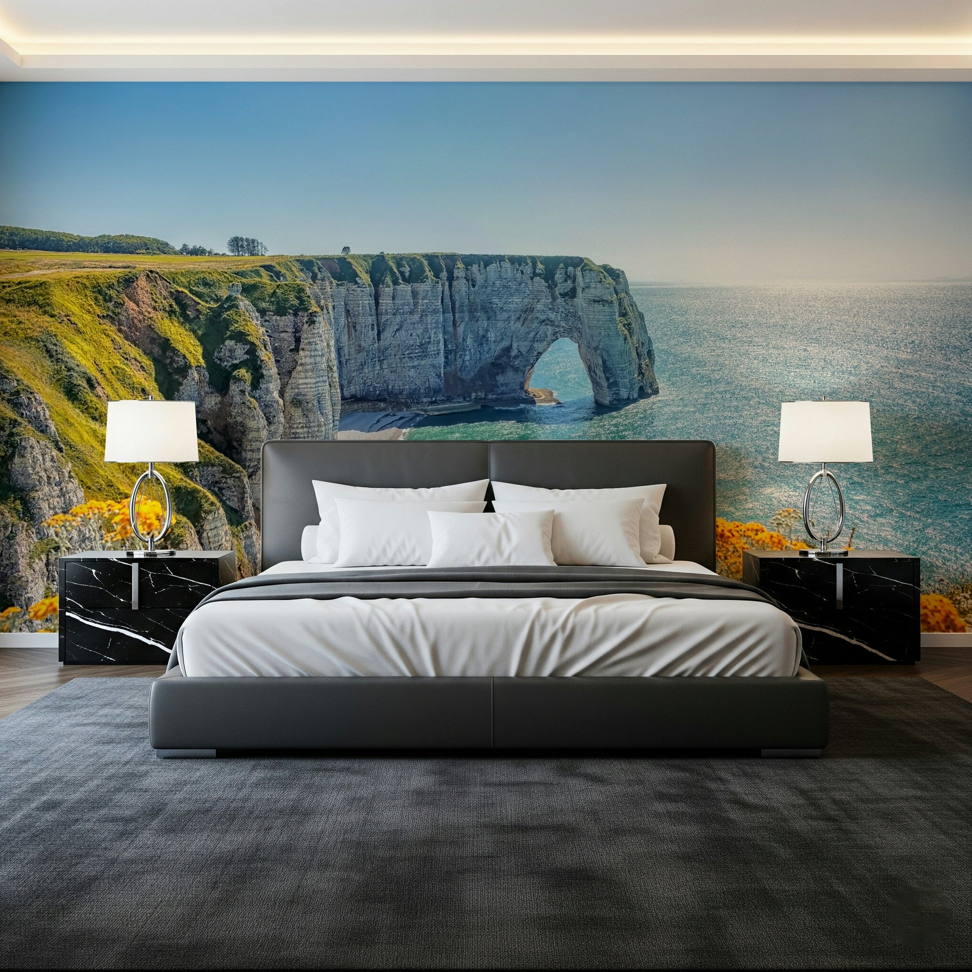 Transform your space with this stunning wallpaper for walls, showcasing the iconic cliffs of Étretat bathed in sunlight. Golden wildflowers highlight the foreground, contrasting beautifully with the blue sea. This panoramic view instantly opens up smaller rooms, bringing a sense of vastness and tranquility to your interior design. The vibrant yellow flowers introduce a cheerful element, brightening any space, while the natural stone texture of the cliffs adds depth and sophistication. Ideal for dining rooms, offices, or a feature wall in your living room, this wallpaper adds a touch of French coastal charm.
