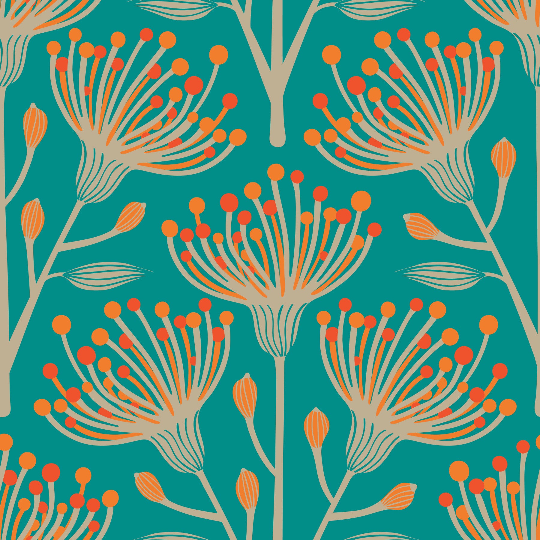 Bring warmth and vibrancy into your space with our Eucalyptus floral botanical wallpaper. Set against a bright turquoise backdrop, this design features stylized eucalyptus blooms in a delightful palette of bright orange, burnt orange and sandy beige. The botanical theme is subtly playful, creating a calming yet cheerful atmosphere. The artful arrangement of floral elements evokes a sense of botanical beauty and Summertime joy, transforming any room into a tranquil and inviting haven. The gorgeous warm color palette and simple, elegant design make this wallpaper ideal for adding a touch of nature-inspired serenity to your living room, bedroom, or any space that craves a refreshing makeover. This pattern design is also available in Other Colourways too! Original wallpaper pattern design by Jackie Tahara of UnBlink Studio.