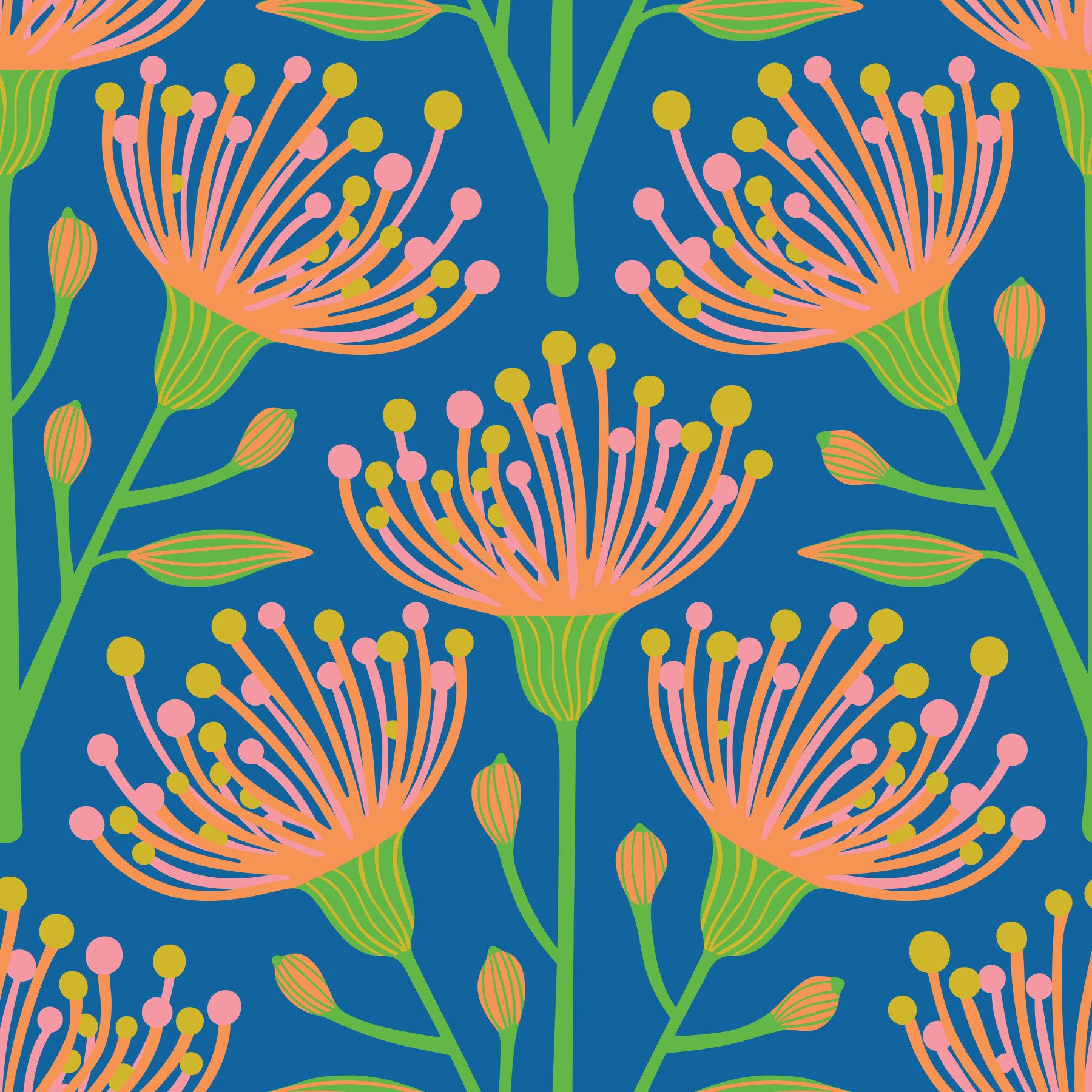 Bring the warmth and vibrancy of Summer into your space with our Eucalyptus floral botanical wallpaper. Set against a bright royal blue backdrop, this design features stylized eucalyptus blooms in a delightful palette of bright orange, pink, yellow and green. The botanical theme is subtly playful, creating a calming yet cheerful atmosphere. The artful arrangement of floral elements evokes a sense of botanical beauty and Summertime joy, transforming any room into a tranquil and inviting haven. The gorgeous color palette and simple, elegant design make this wallpaper ideal for adding a touch of nature-inspired serenity to your living room, bedroom, or any space that craves a refreshing makeover. Embrace the lighthearted spirit of Summer all year round with this captivating botanical design. This pattern design is also available in Other Colourways too! Original wallpaper pattern design by Jackie Tahara of UnBlink Studio.