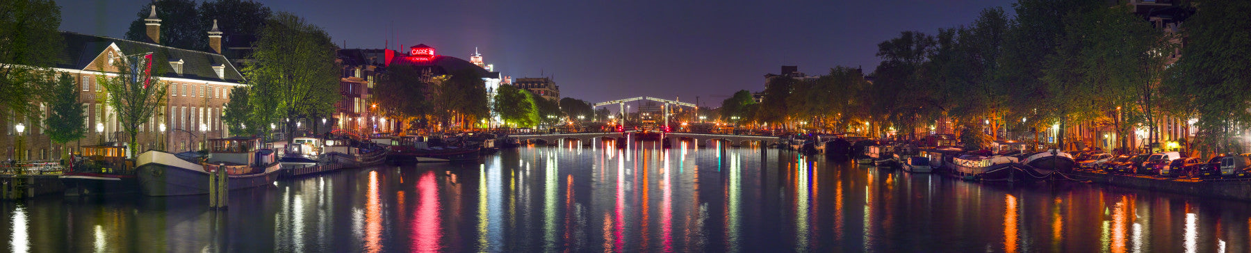 Evening view of canal through Amsterdam city. Immerse yourself in a tranquil Amsterdam scene at twilight. The water reflects the city's lights, creating a captivating panorama. The blend of classic architecture and modern illumination creates a sophisticated design. Transform your home office or lounge with this wallpaper for walls. Its calming colors of navy and amber work well in modern or classic interiors. Add a touch of Dutch charm to your walls.