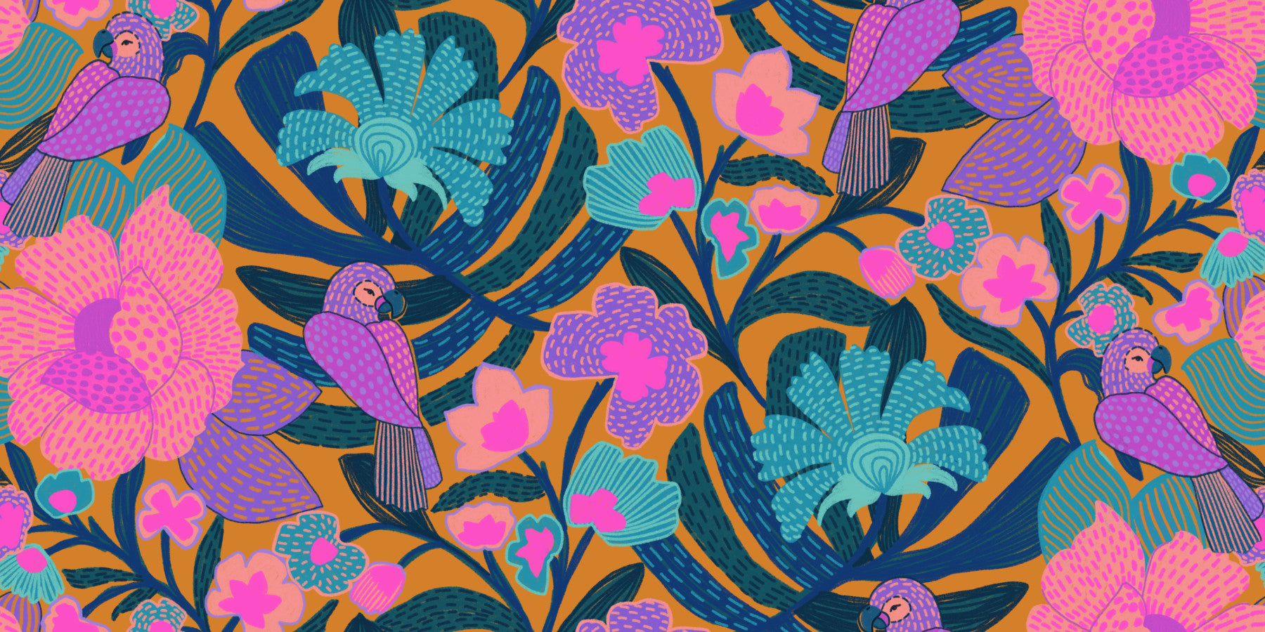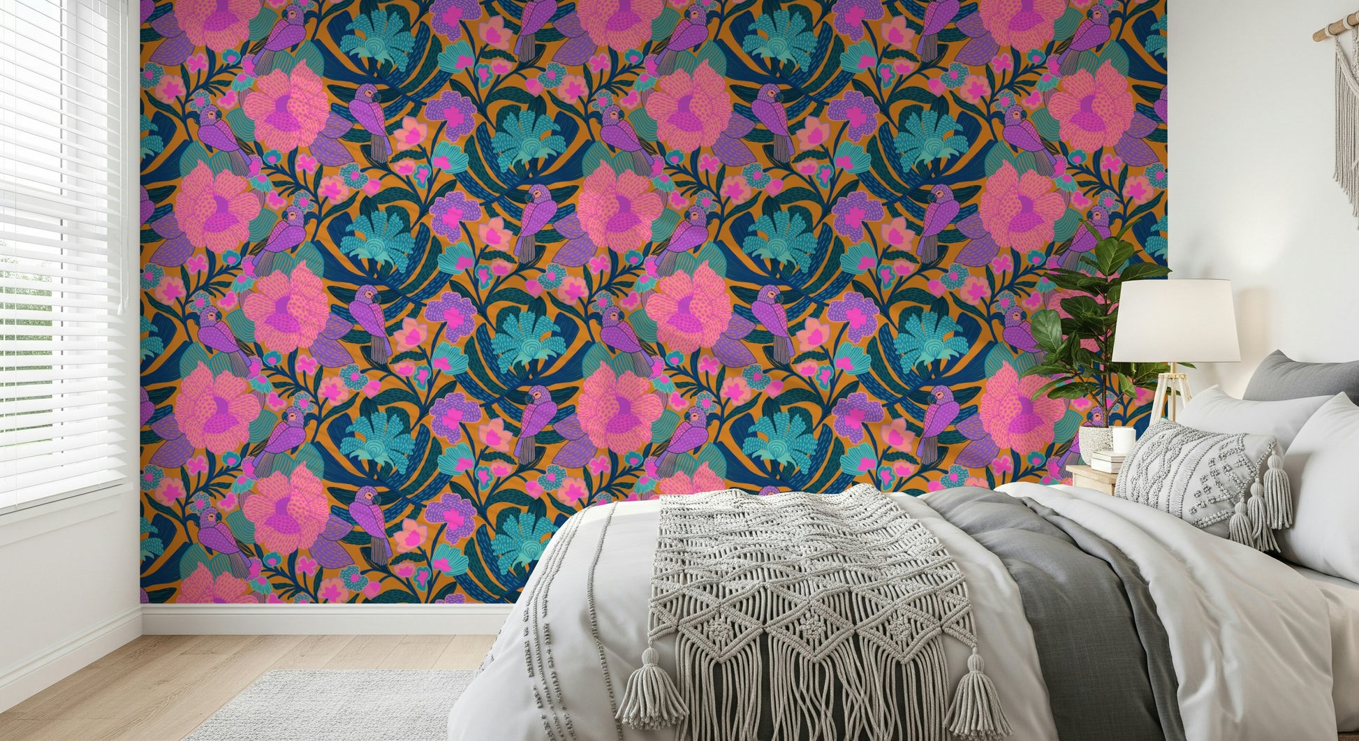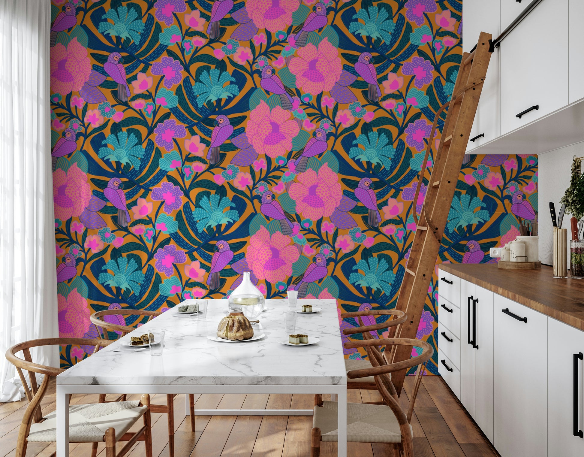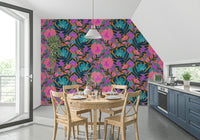 Infuse your home with the charm of this exotic bloom wallpaper. Featuring colourful parrots and vibrant floral patterns, this wallpaper for walls adds a touch of playfulness to your interior decor. With its bold combination of pink, purple, turquoise, and orange hues, this design creates a focal point in any room, bringing an element of nature indoors. Perfect for bedrooms, living rooms, or nurseries, this unique wallpaper offers a visually stimulating and aesthetically pleasing backdrop that complements a variety of design styles.