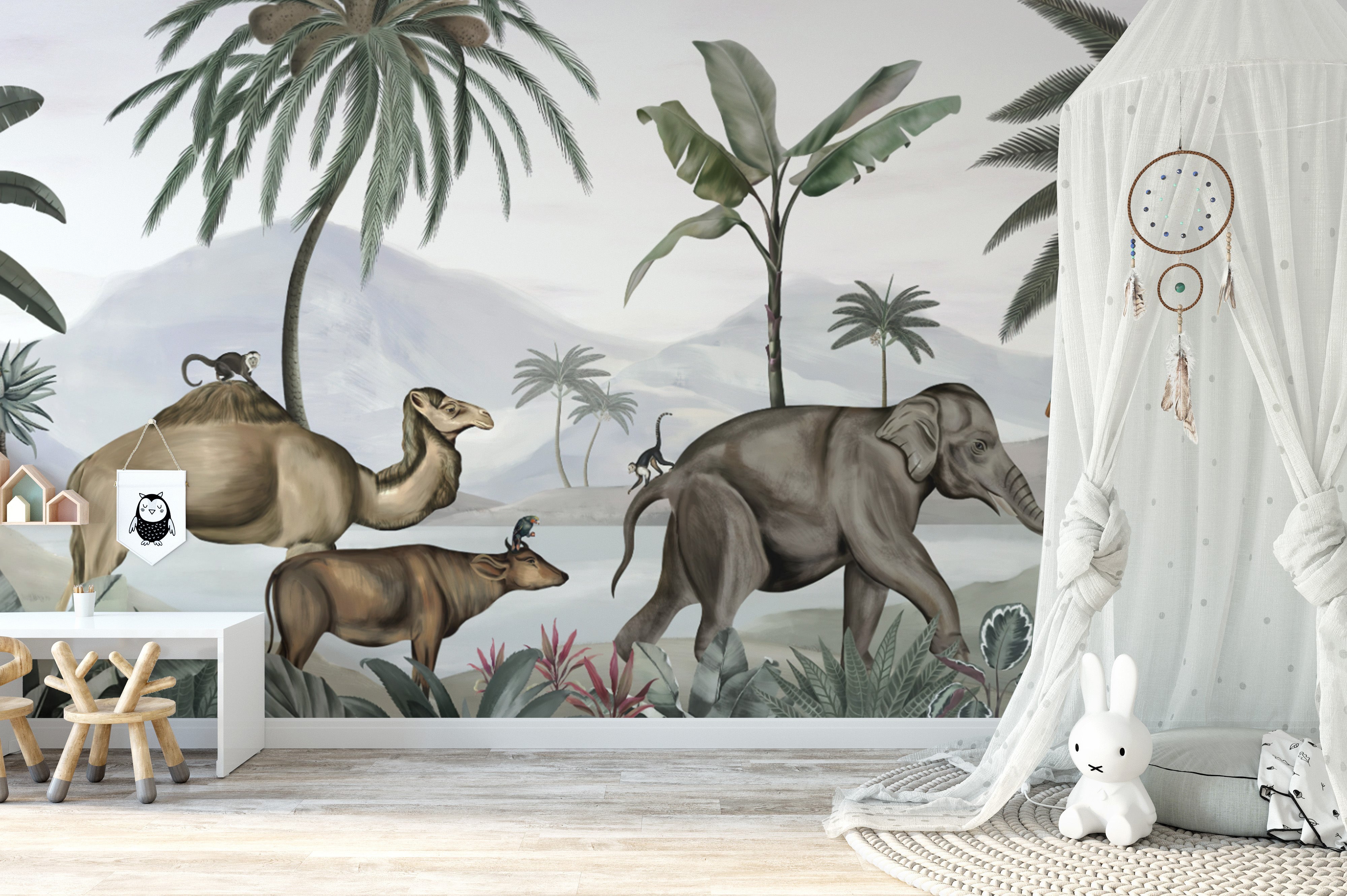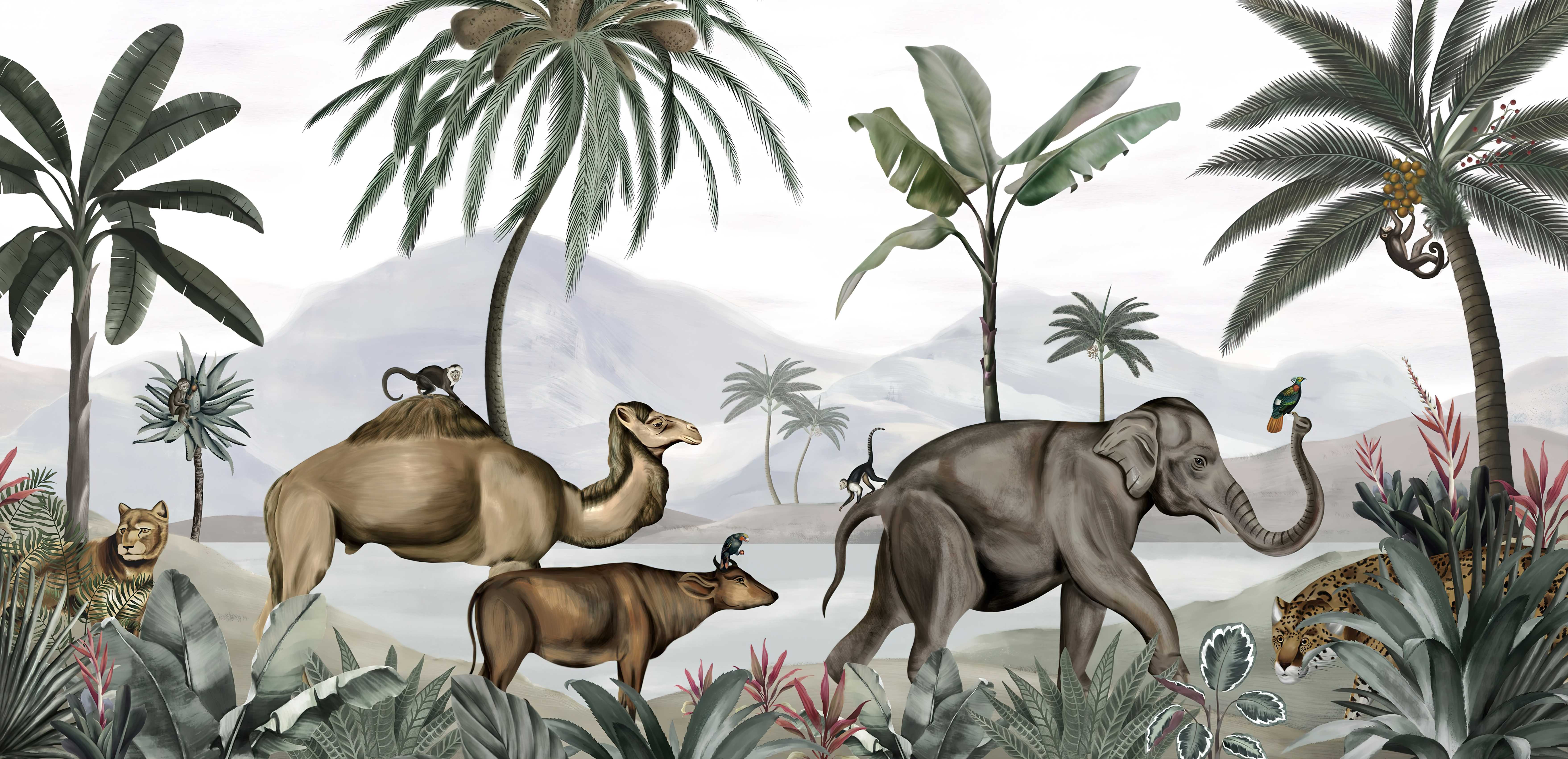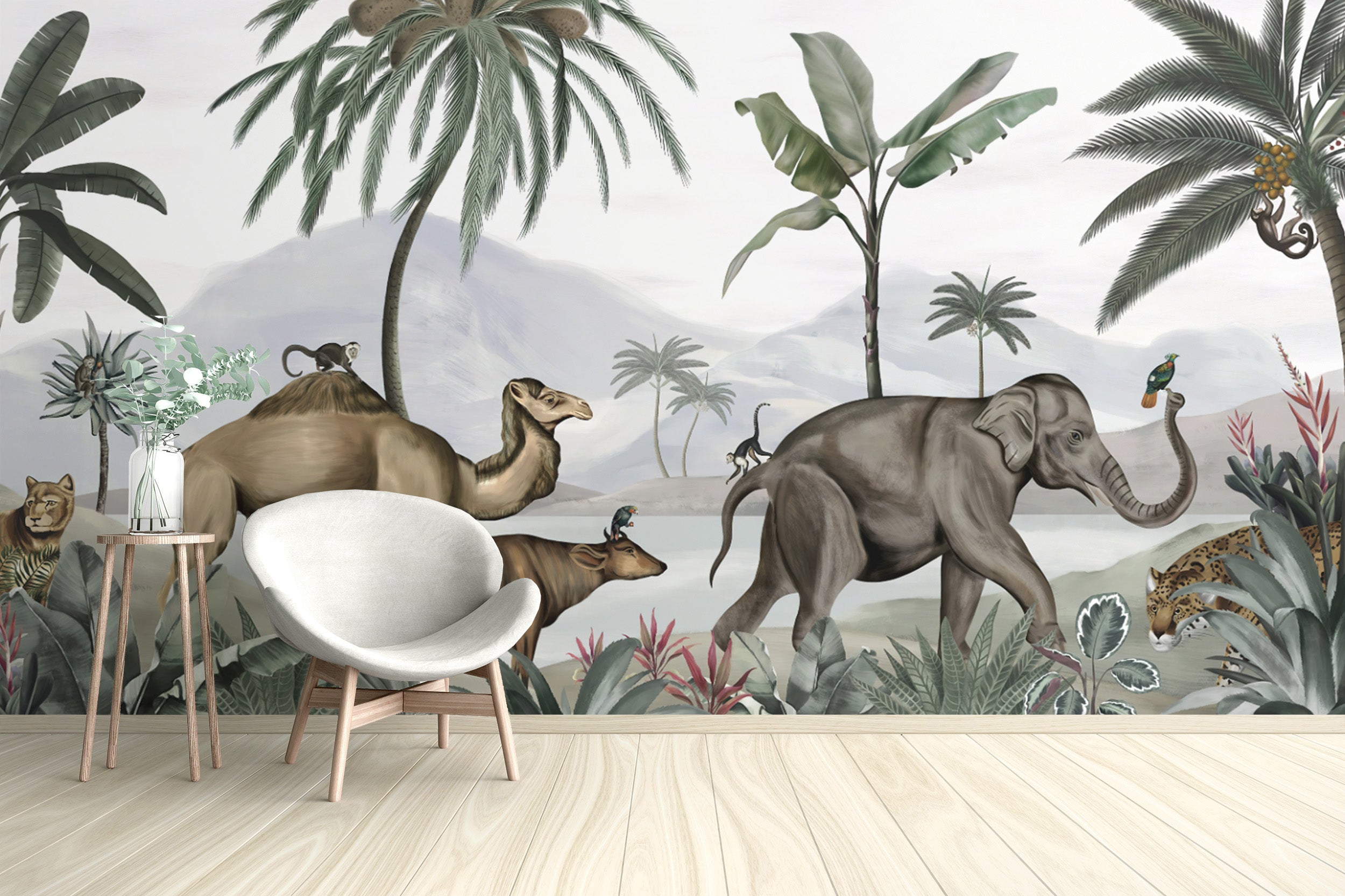 Turn your room into an amazing jungle safari wallpaper expedition with our Exotic Jungle Safari Animal Mural. This hand-painted work includes a beautiful wildlife scene, including elephants, camels, and leopards on top of rich, green tropical vegetation. Very suitable for a nature-like environment, this tropical animal wall painting has the feeling of the wild in your living room. Ideal for nurseries, living areas, and children's rooms, this wildlife wallpaper mural provides an atmospheric and artistic backdrop. Upgrade your interiors with this safari experience wallpaper, which will thrill and motivate you. Feel the grace of nature today with this tropical forest wallpaper.