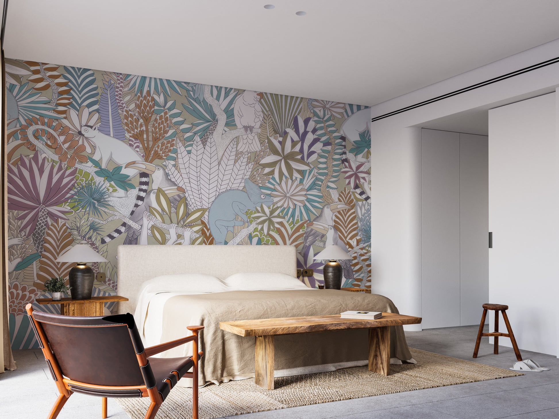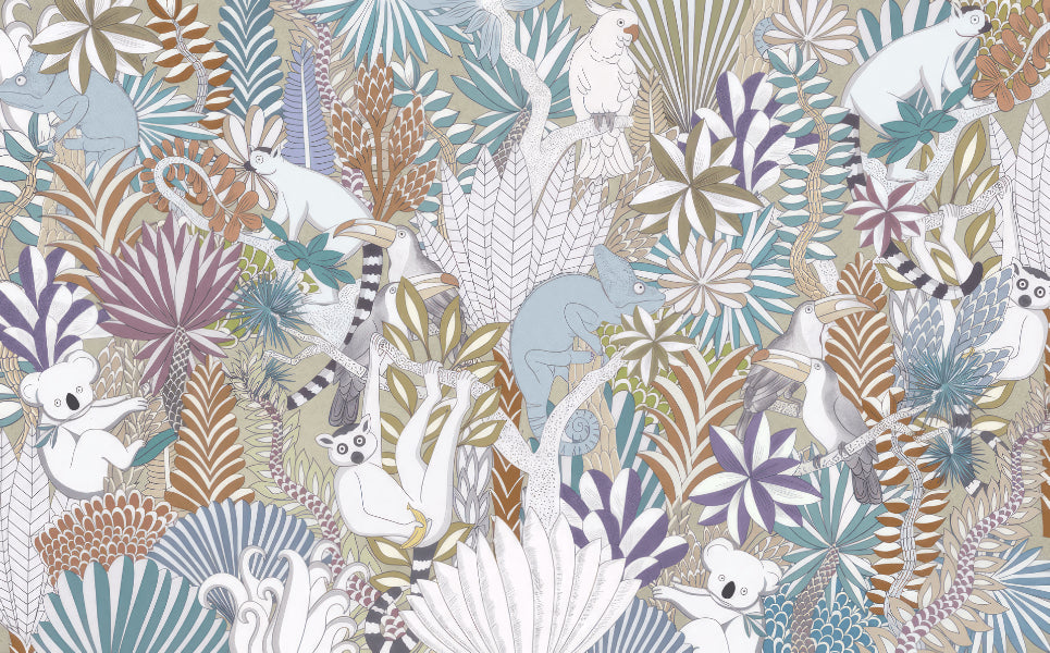Elegant jungle-themed mural wallpaper with pastel tones.