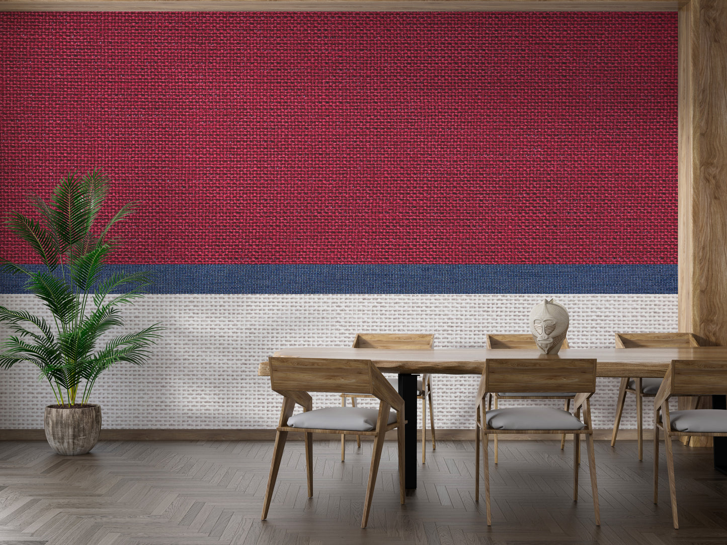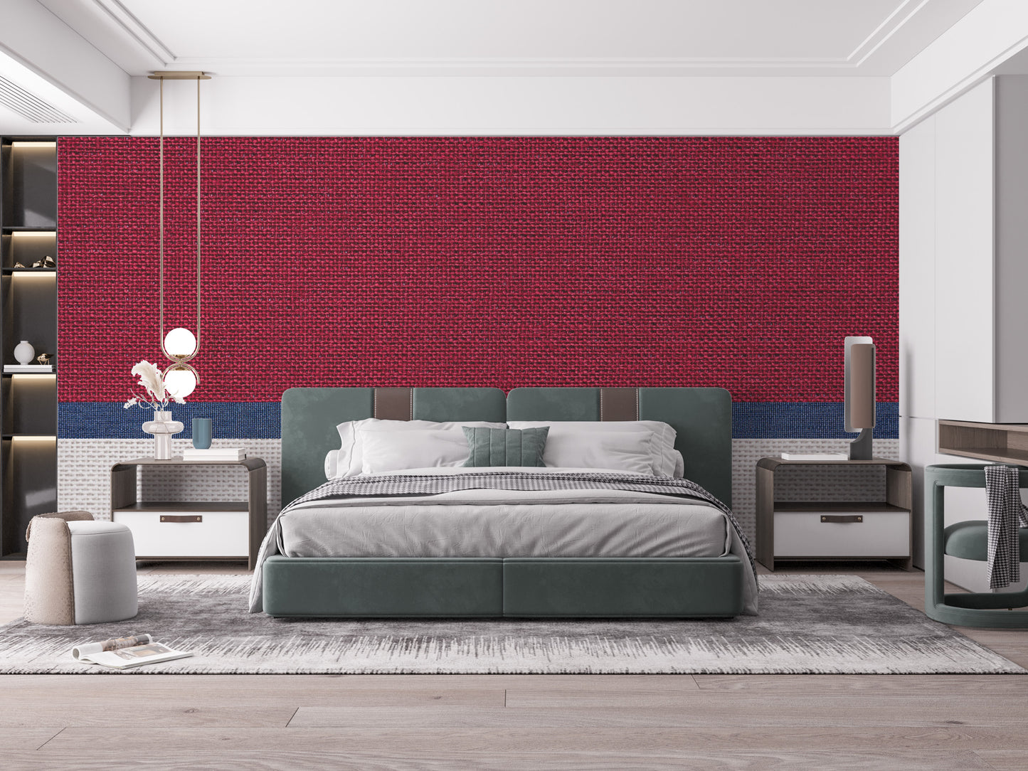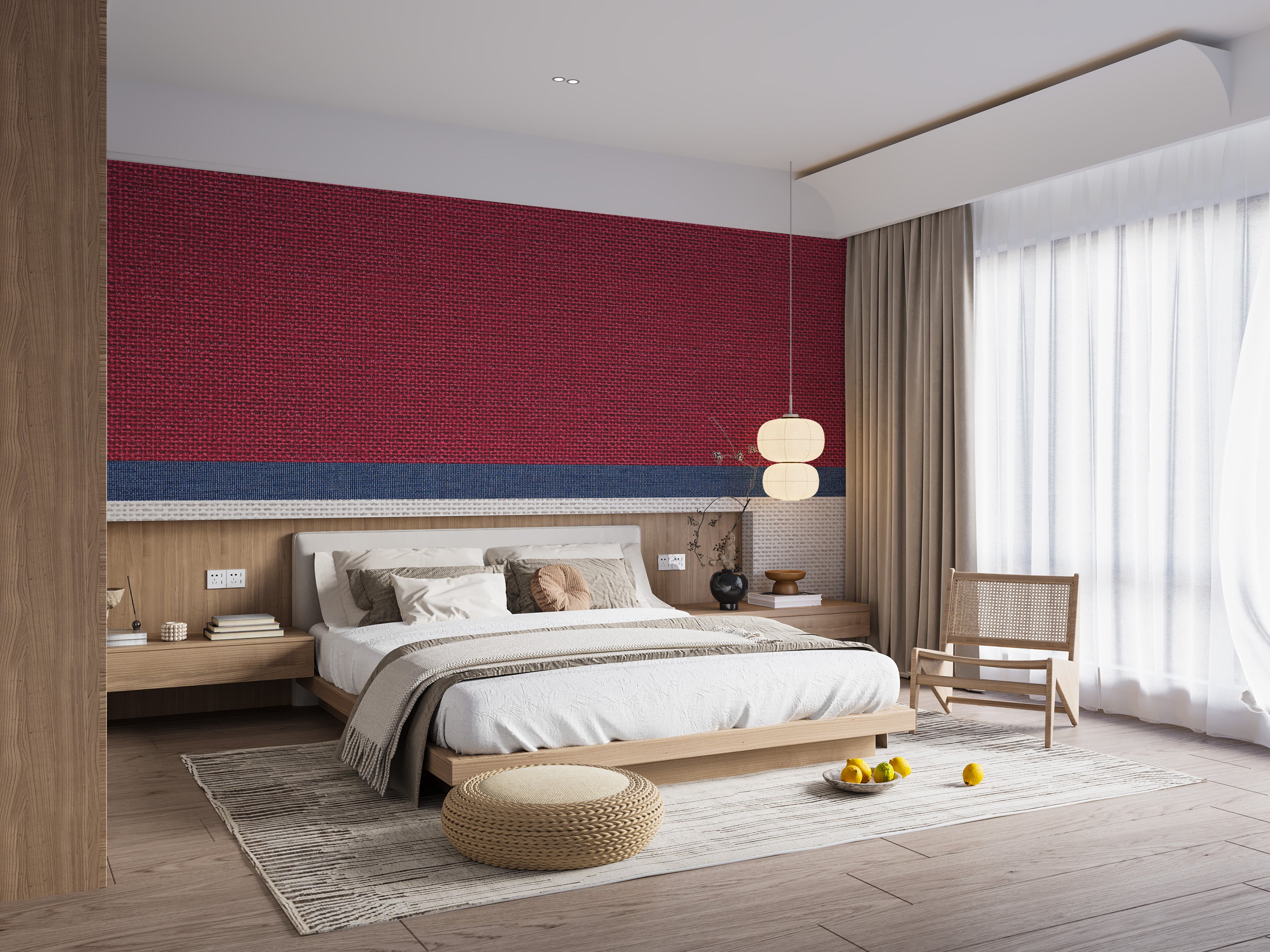 Tied thread fabric wallpaper for a soft, woven aesthetic.
