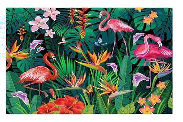 Rise your living space with the Fabulous Fancy Flamingo Wallpaper Mural. This exquisite design features playful flamingos dancing amidst lush tropical greenery, vibrant flowers, and fluttering butterflies. The mural's rich palette brings a dynamic burst of color to any room, transforming dull walls into a captivating feature wall.