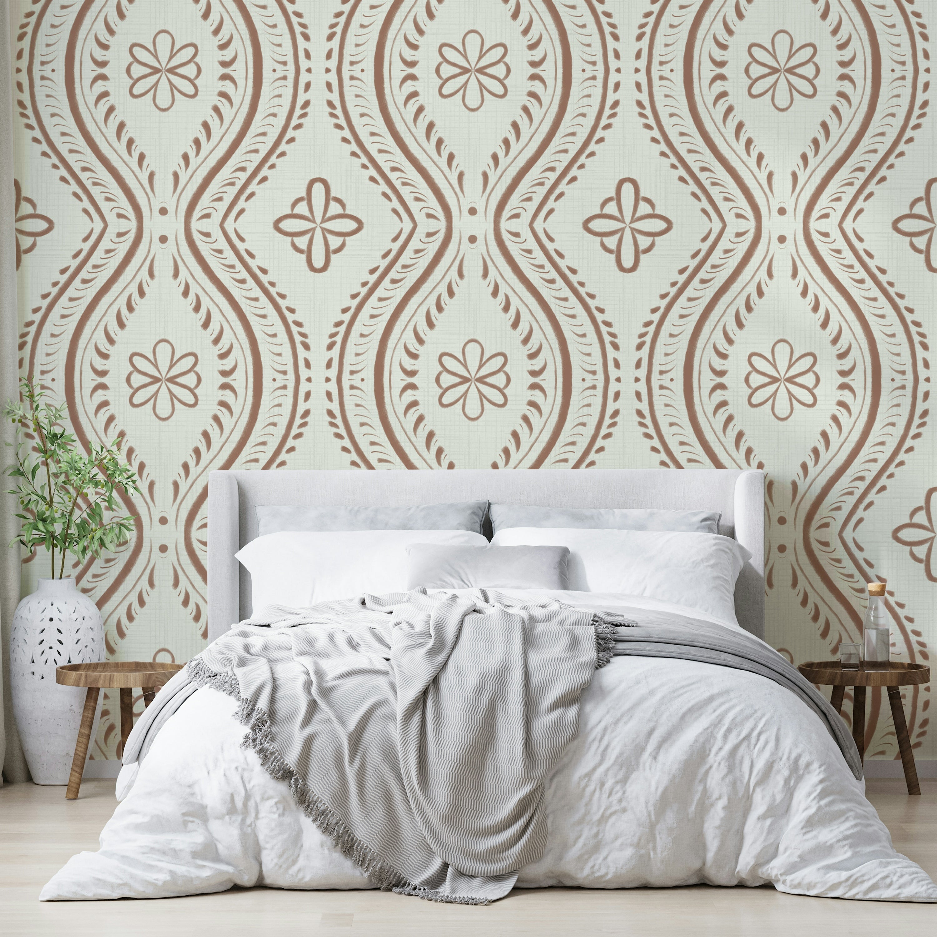 Indulge in the serene elegance of "Faded Ogee Damask - Bright - Mocha Mousse." This wallpaper showcases a subtly textured off-white background, adorned with a captivating mocha mousse-colored damask pattern. The design features softly faded ogee curves, creating a sense of gentle movement and understated sophistication. A central, stylized flower adds a touch of delicate charm, perfectly complementing the overall muted yet bright aesthetic. The soft color palette and organic patterns evoke a feeling of calm and refined beauty, making this wallpaper an ideal choice for a tranquil and stylish space. The subtle texture adds depth without overwhelming the design, ensuring it remains both visually engaging and effortlessly chic.