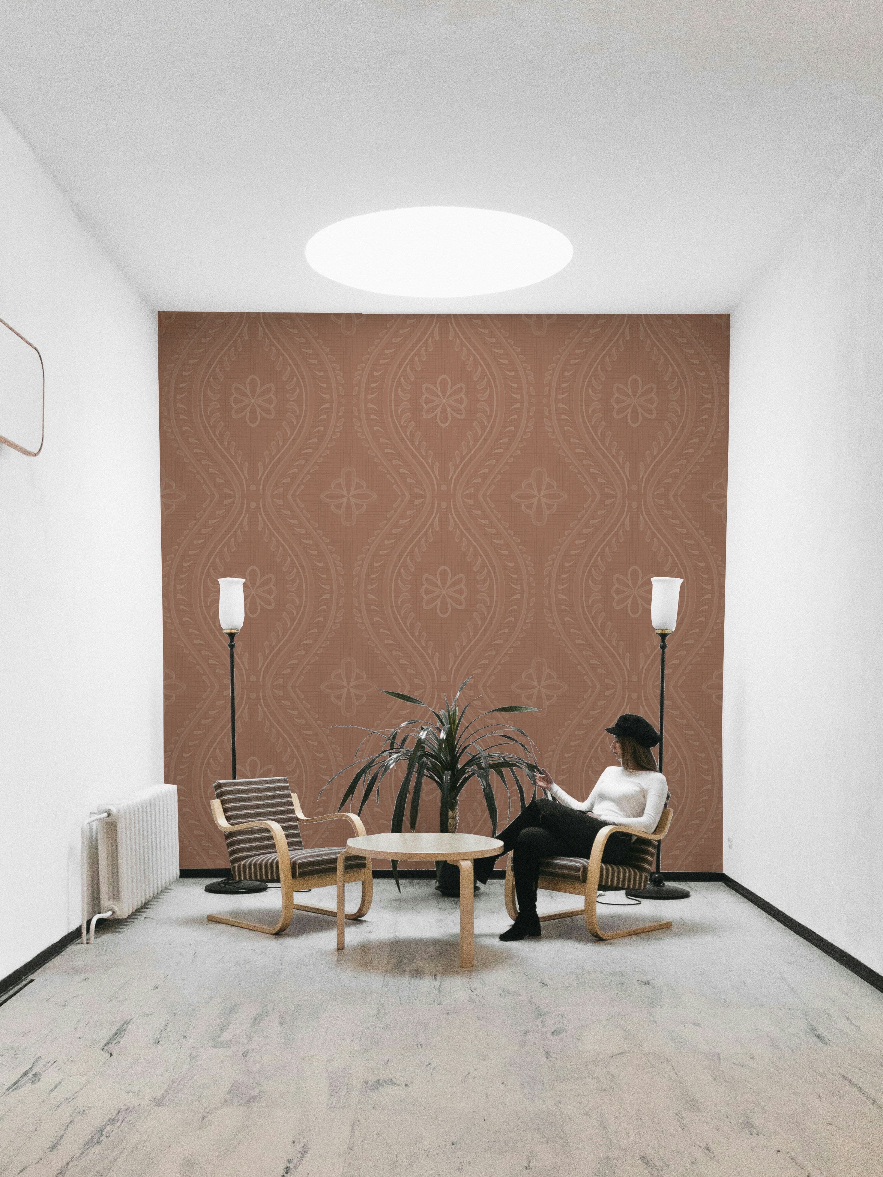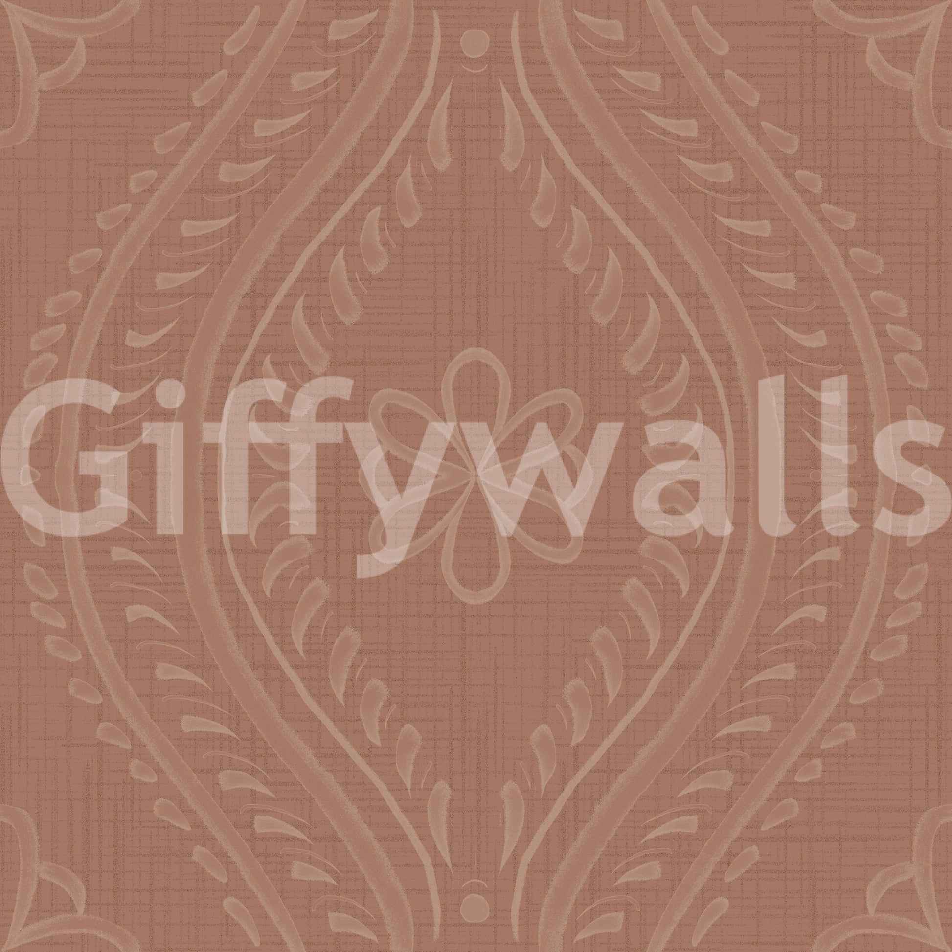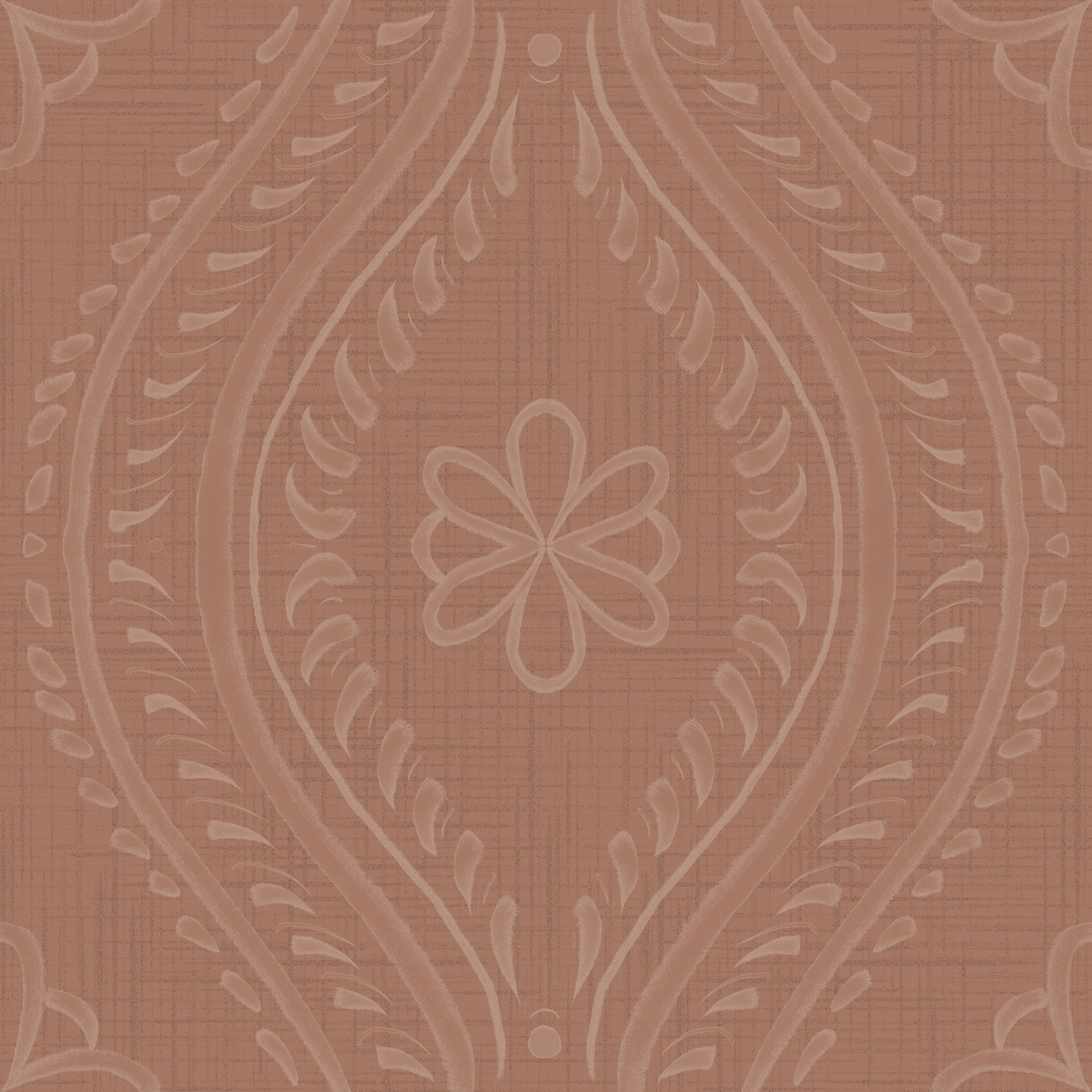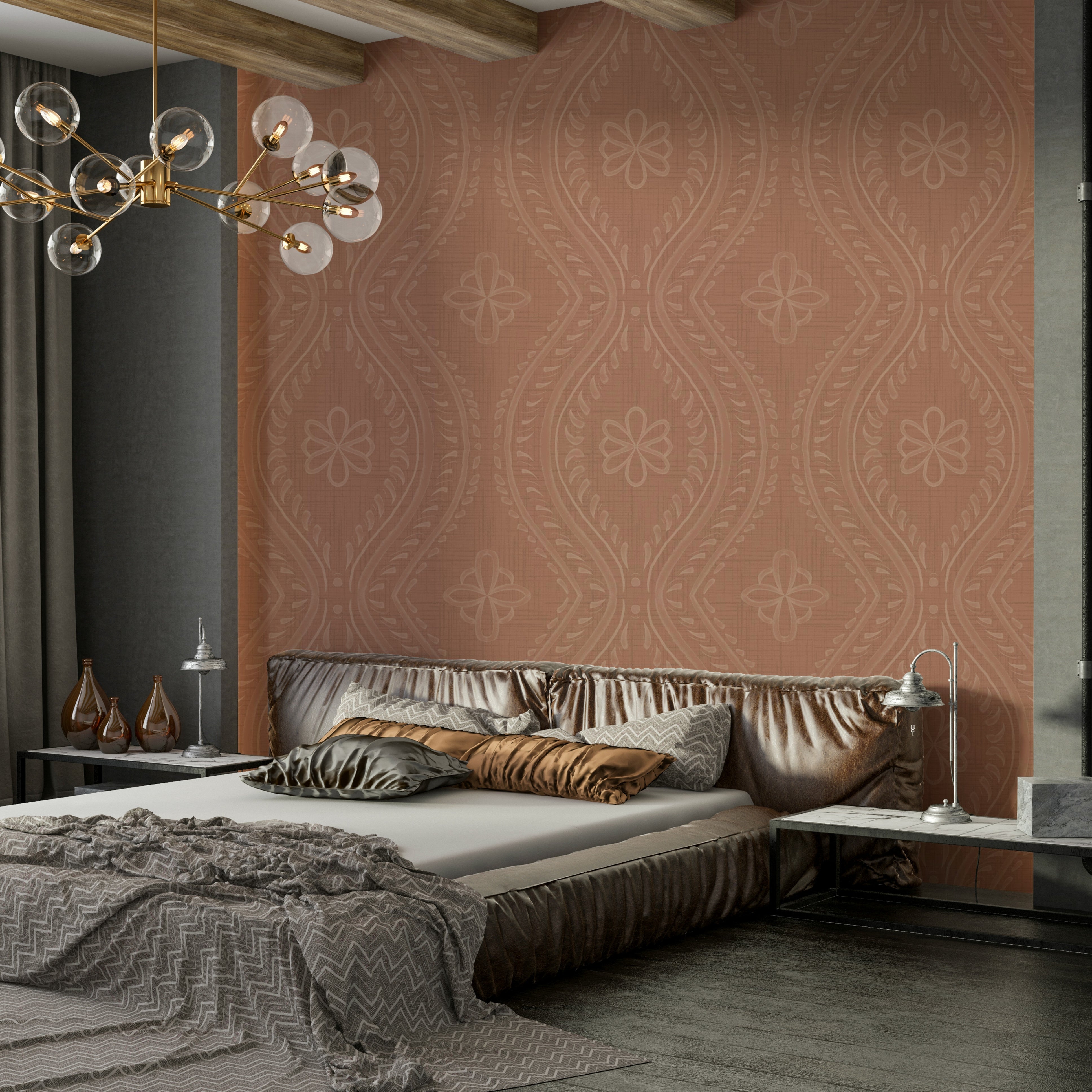 Warm-toned wallpaper with subtle ogee damask motif