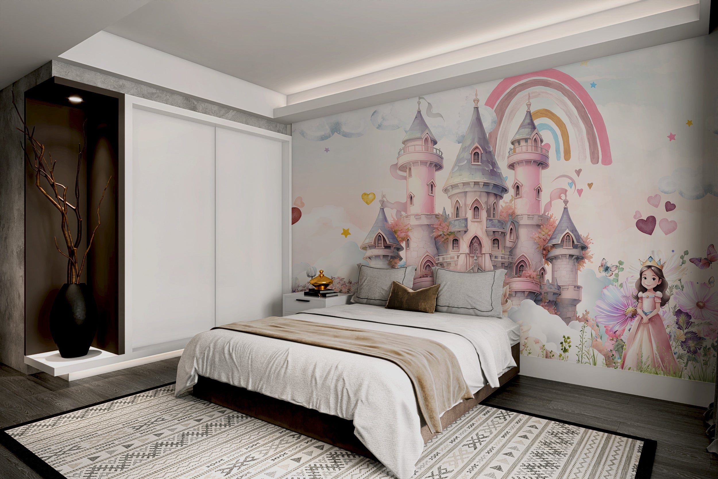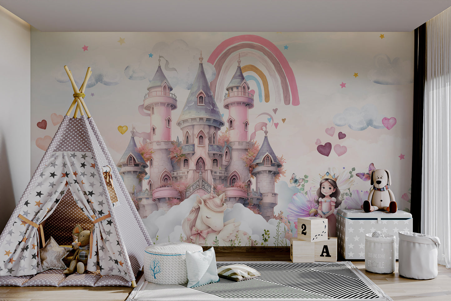 Whimsical castle with a unicorn and rainbow for a magical room setting