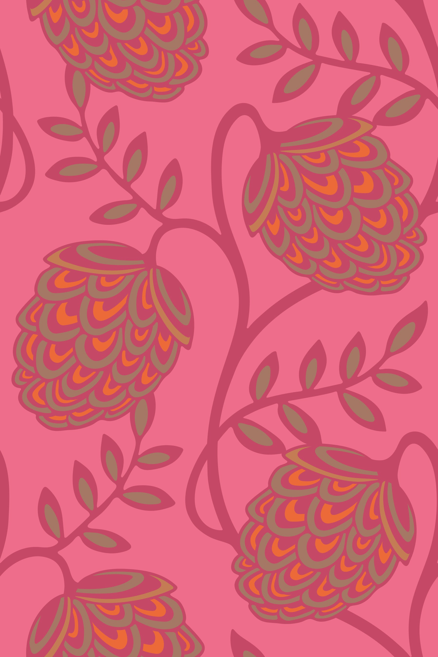 Immerse yourself in the enchanting allure of Fantasia a wallpaper design that seamlessly blends botanical wonder with modern Art Nouveau flair. This organic design features stylized flower vines and leaves crafted with a gentle, curving aesthetic that is a modern twist on classic Art Nouveau style. The sophisticated palette of magenta, orange and mocha mousse brown on a pink background creates a soothing, warm and elegant ambiance, perfect for bedrooms, living rooms, or any space desiring a touch of refined and earthy elegance. This pattern design is also available in Other Colourways too! Original wallpaper pattern design by Jackie Tahara of UnBlink Studio.